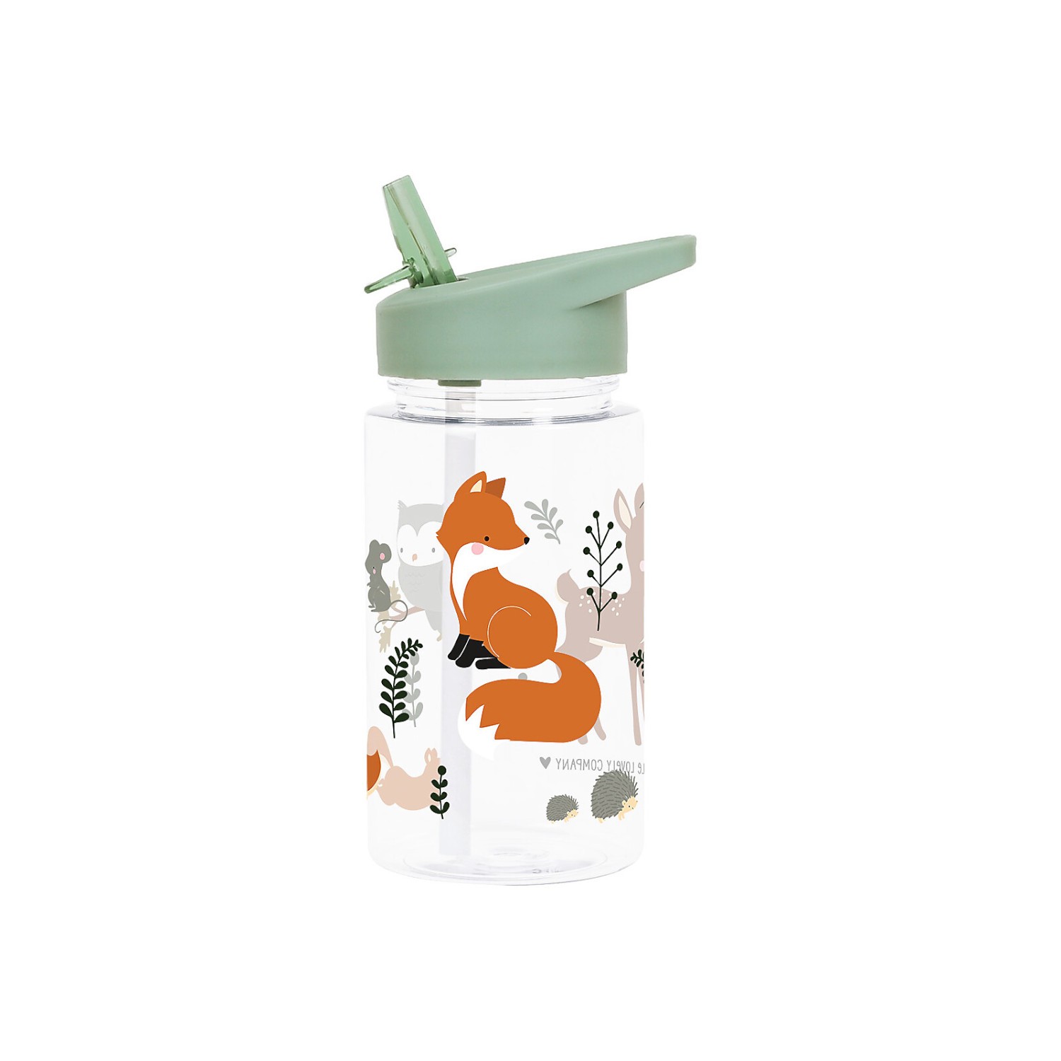 Borraccia di plastica trasparente per bimbo con graziosi disegni di animali della foresta come volpi, cerbiatti, gufetti, scoiattoli e ricci, dotata di tappo color verde e pratica cannuccia apri-chiudi.