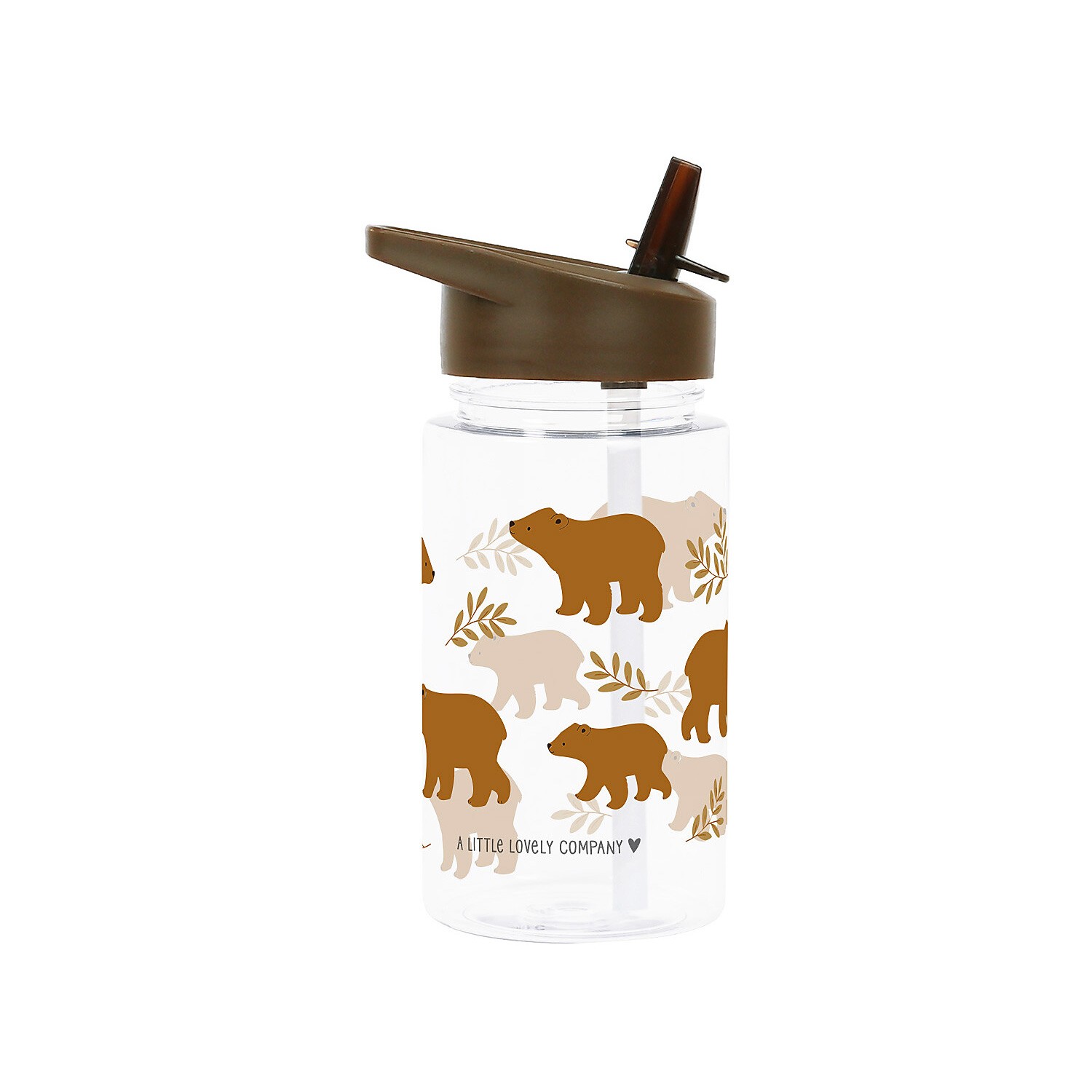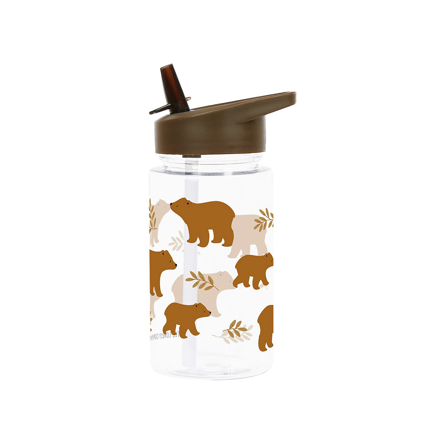Borraccia di plastica trasparente per bimbo con graziosi orsi grizzly disegnati, dotata di tappo marrone e pratica cannuccia apri-chiudi.