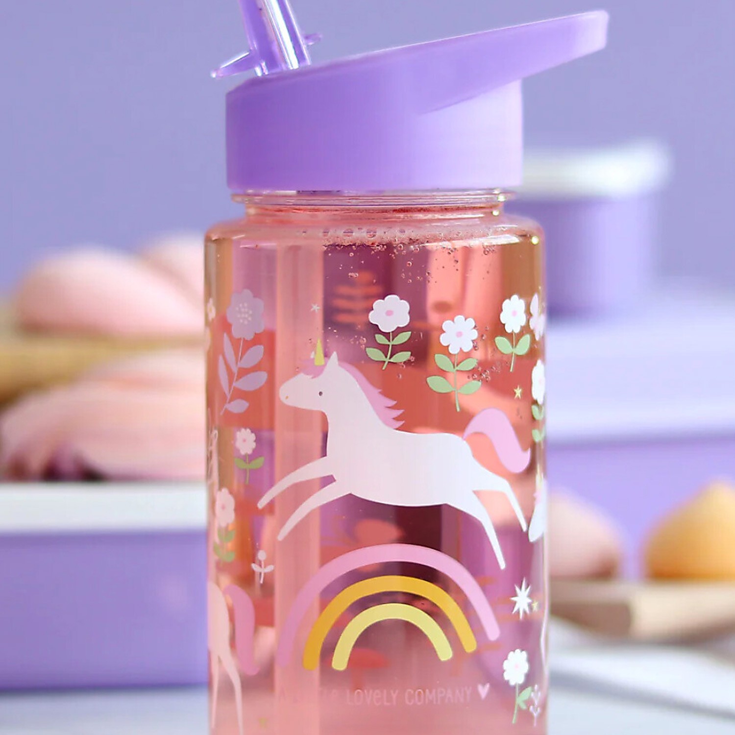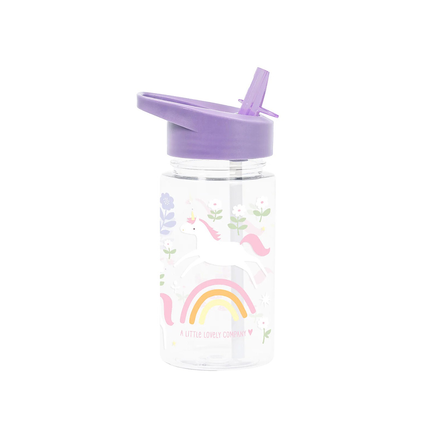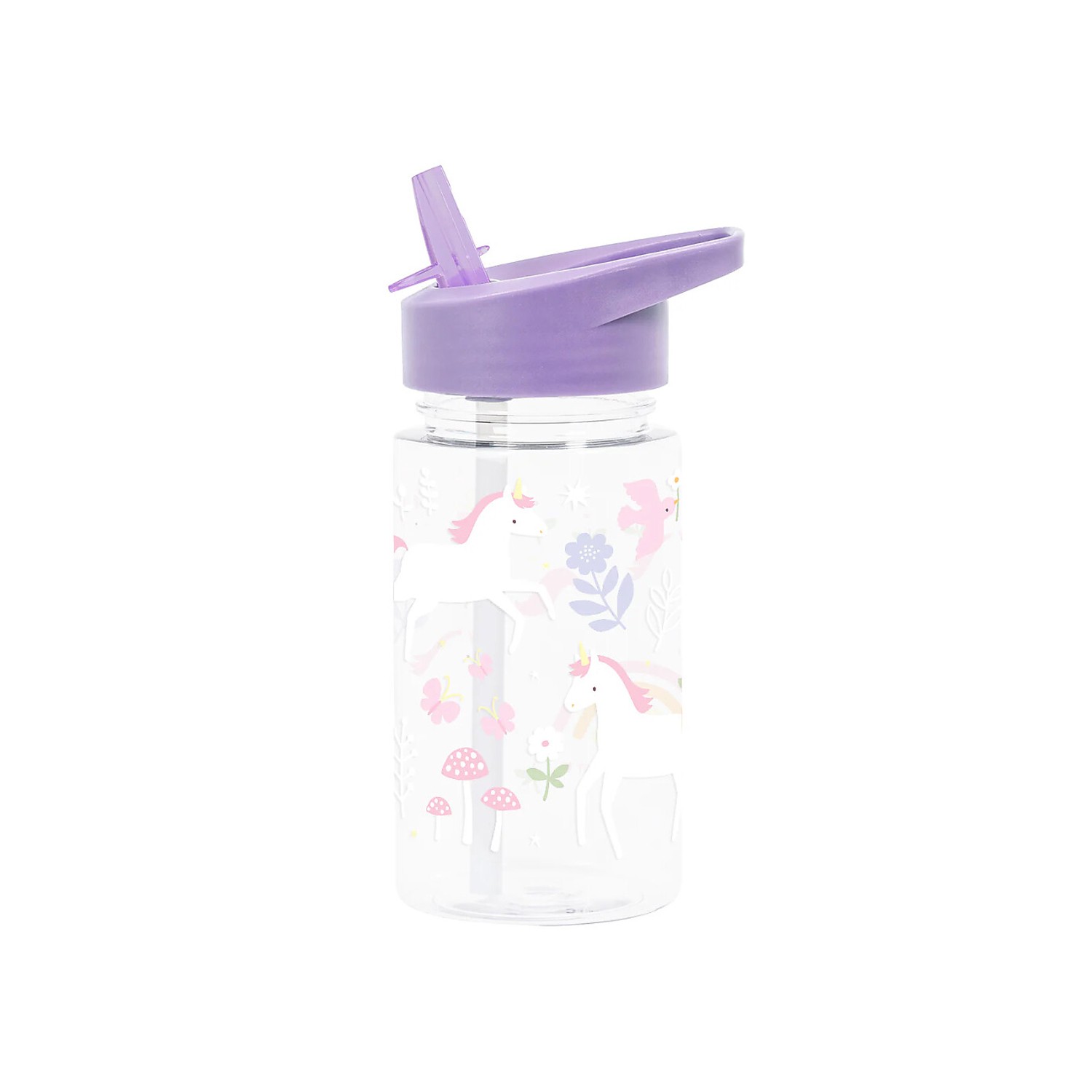 Borraccia in plastica trasparente con graziosi unicorni disegnati, dotata di tappo lilla e pratica cannuccia apri-chiudi.