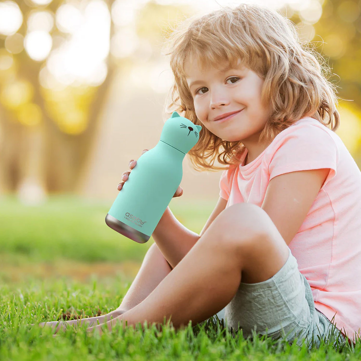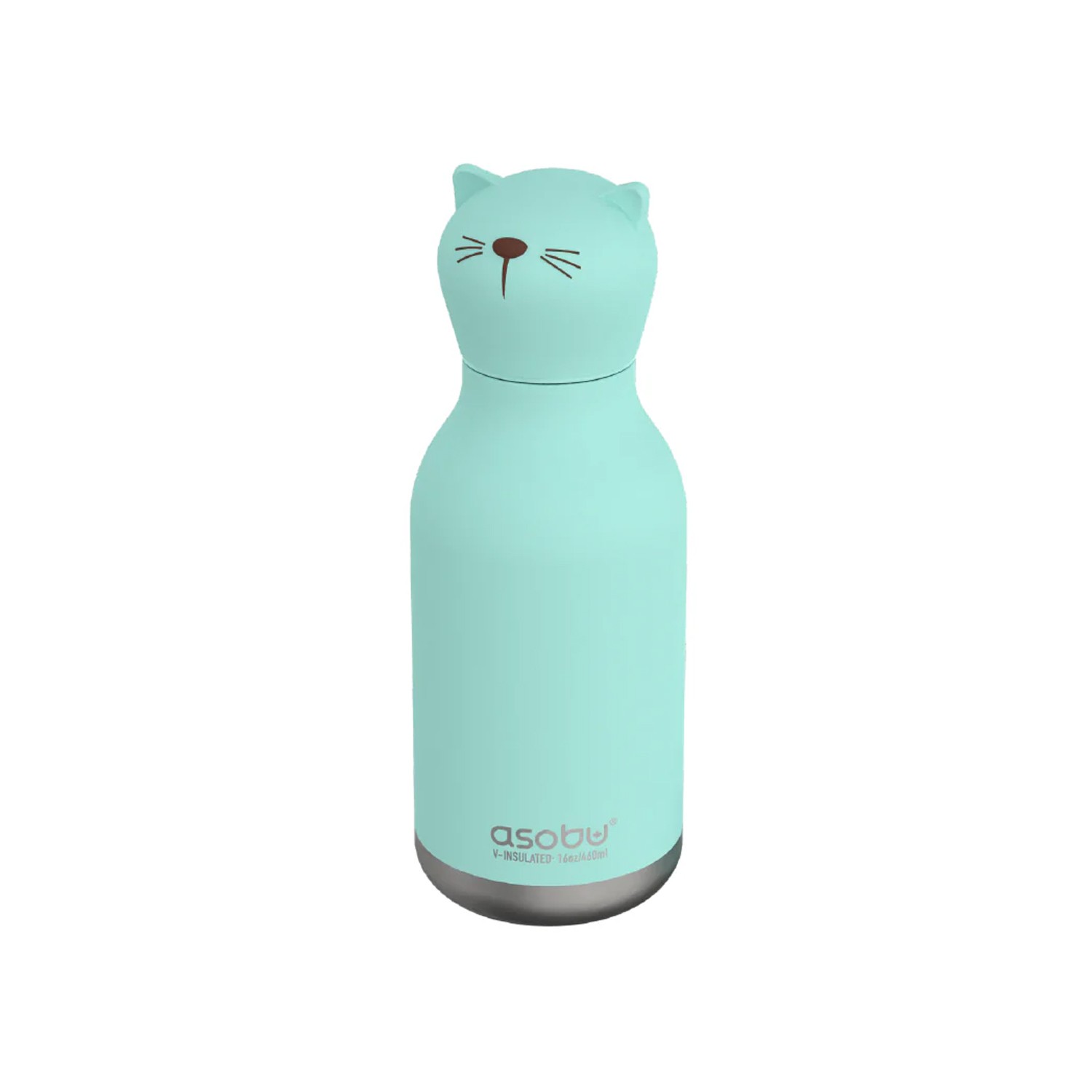 Questa borraccia in acciaio inox presenta un tappo-testa dal design a forma di gattino verde acqua.