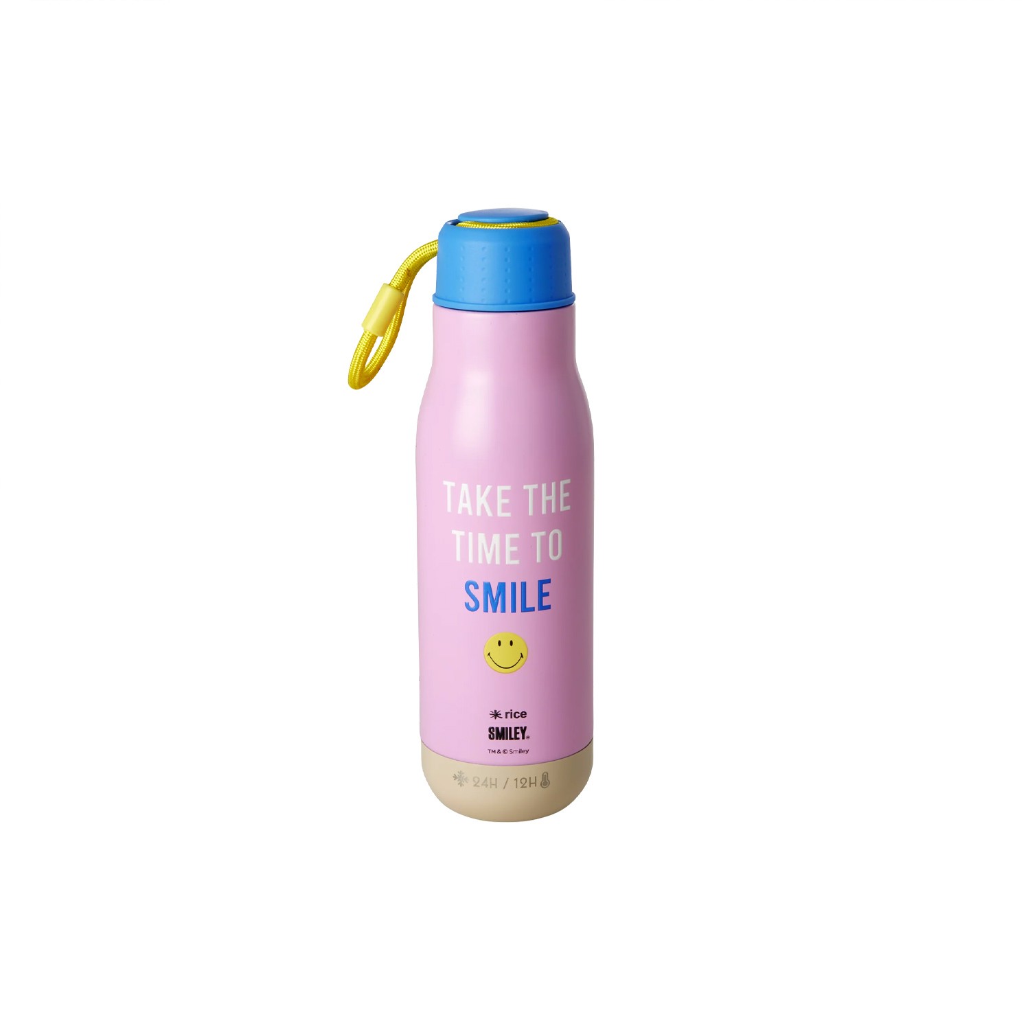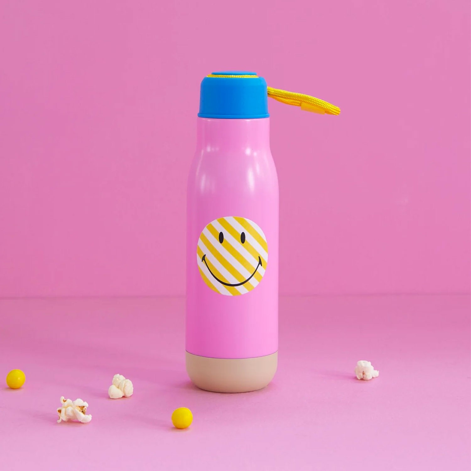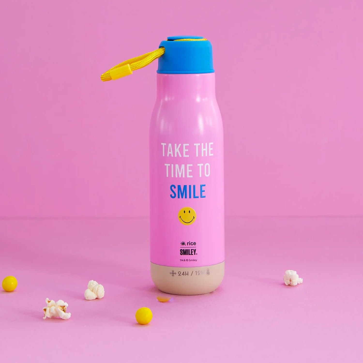Direttamente dalla nuova collaborazione di Rice con Smiley, questa borraccia in acciaio inox, decorata con simpatico smile giallo da una parte e scritta Take the Time to Smile dall’altra, non solo è bella da vedere, è anche super pratica, facile da usare e di ottima qualità. Può contenere 500 ml e può mantenere un liquido caldo per 12 ore o freddo per 24 ore. Questa borraccia rosa è piena di dettagli come il coperchio azzurro e il pratico laccio giallo col quale puoi appenderla alla borsa se stai facendo escursioni!
