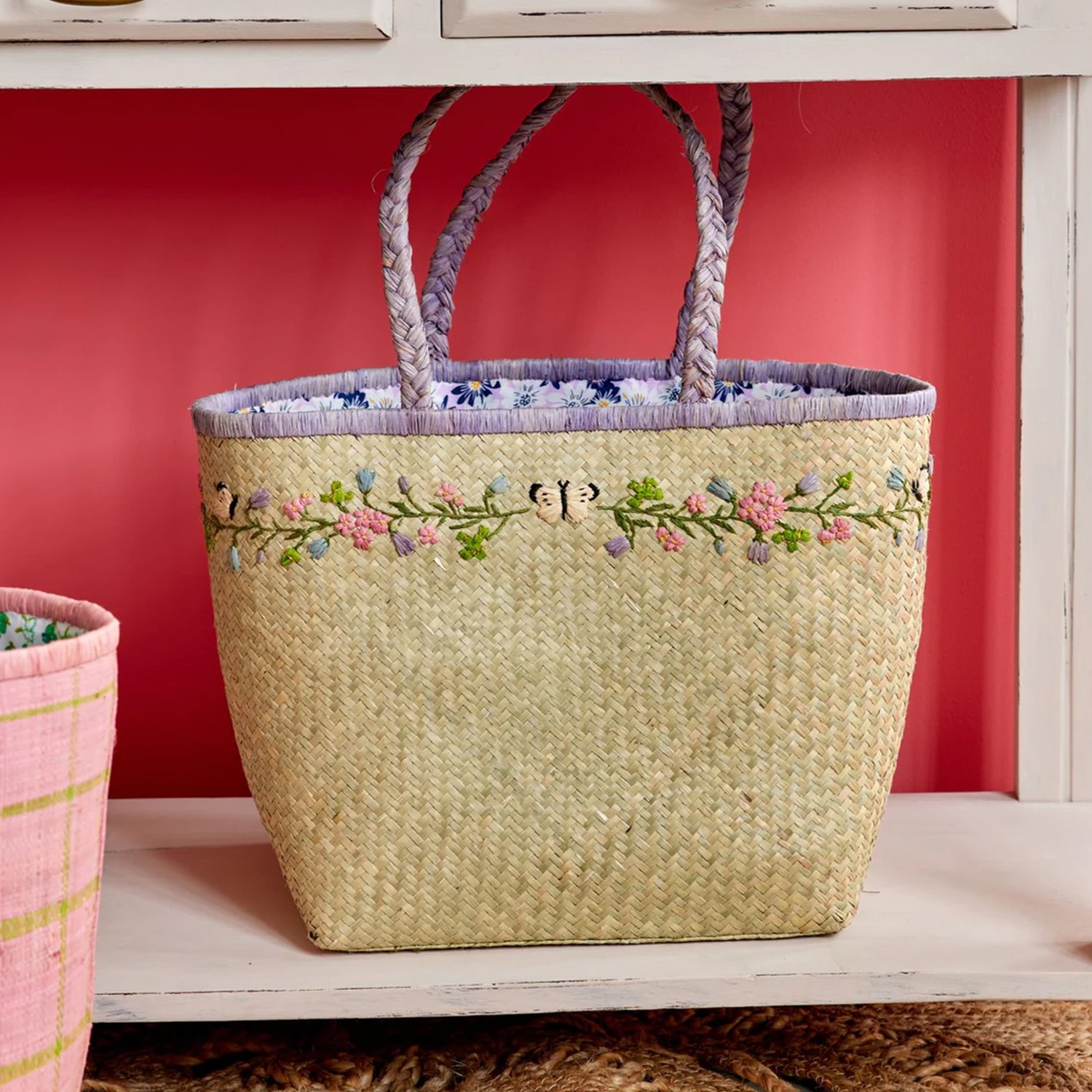 Siamo assolutamente innamorati di questa borsa in rafia con dettagli floreali e farfalle ricamati a mano. I manici color lavanda aggiungono un fine ed elegante tocco di colore, mentre la chiusura in tessuto stampato a fiori, realizzata nella parte interna superiore, garantisce che i tuoi effetti personali rimangano al sicuro. Perfetta per una giornata all'aperto o una breve gita al mercato – ed è anche realizzata in rafia, un materiale sostenibile!