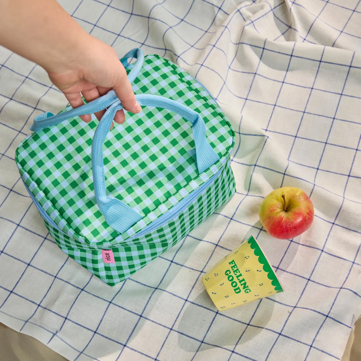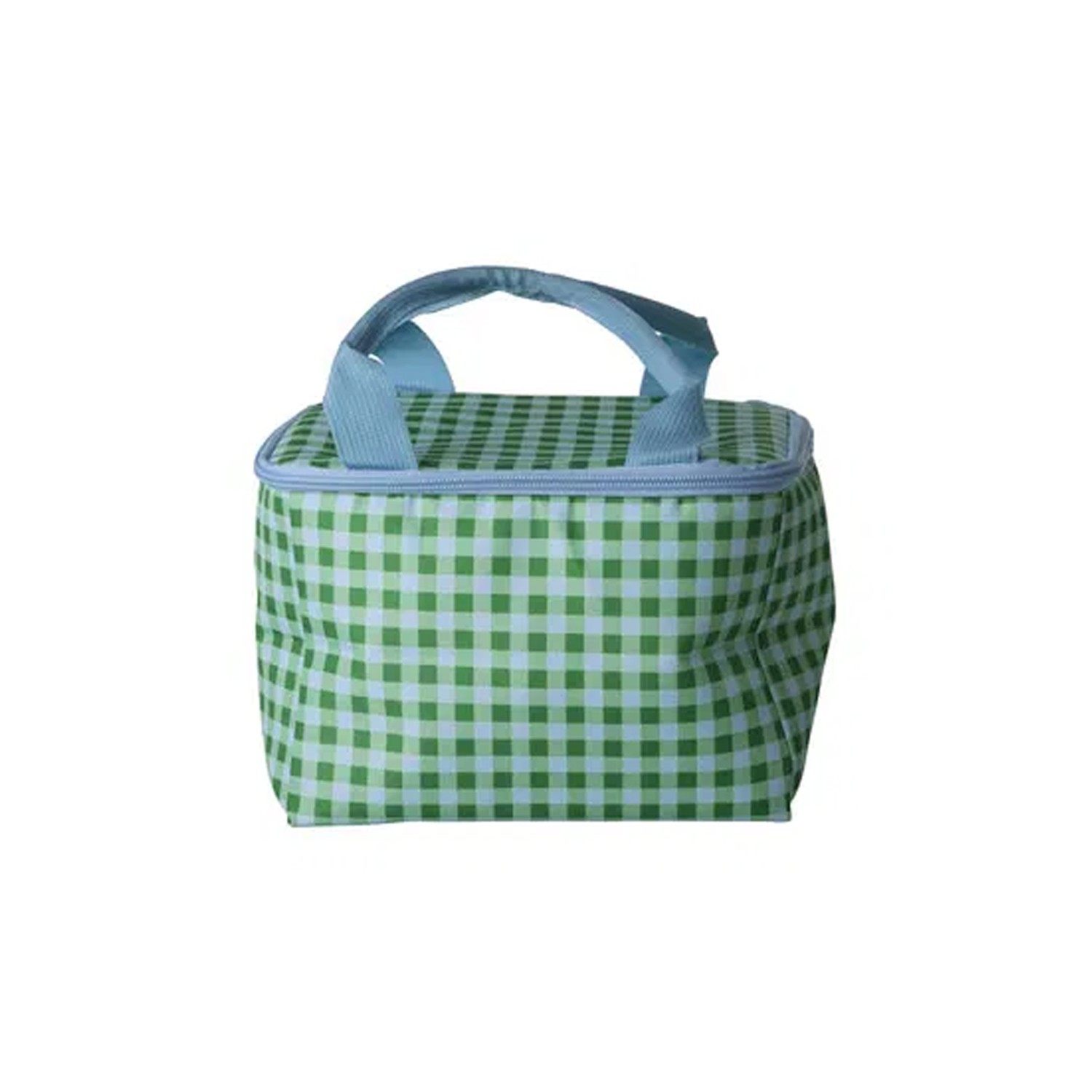 Borsa termica divertente e funzionale abbellita da una simpatica e colorata fantasia a quadretti verdi. Dotata di chiusura a zip su tutti i lati e di pratici manici azzurri che la rendono facile da trasportare, sia che tu stia andando al parco o in spiaggia. All'interno, c'è molto spazio per mantenere tutto quanto al fresco.