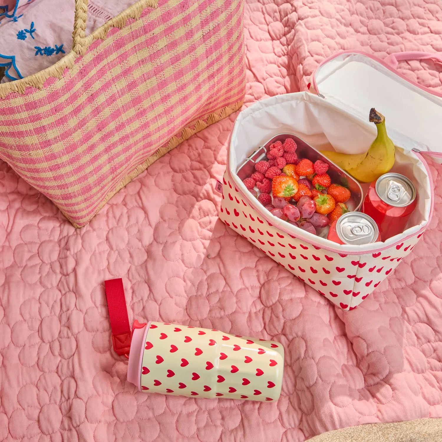 Borsa termica divertente e funzionale abbellita da una graziosa fantasia di cuoricini su sfondo color crema. Dotata di chiusura a zip su tutti i lati e di pratici manici rosa che la rendono facile da trasportare, sia che tu stia andando al parco o in spiaggia. All'interno, c'è molto spazio per mantenere tutto quanto al fresco.