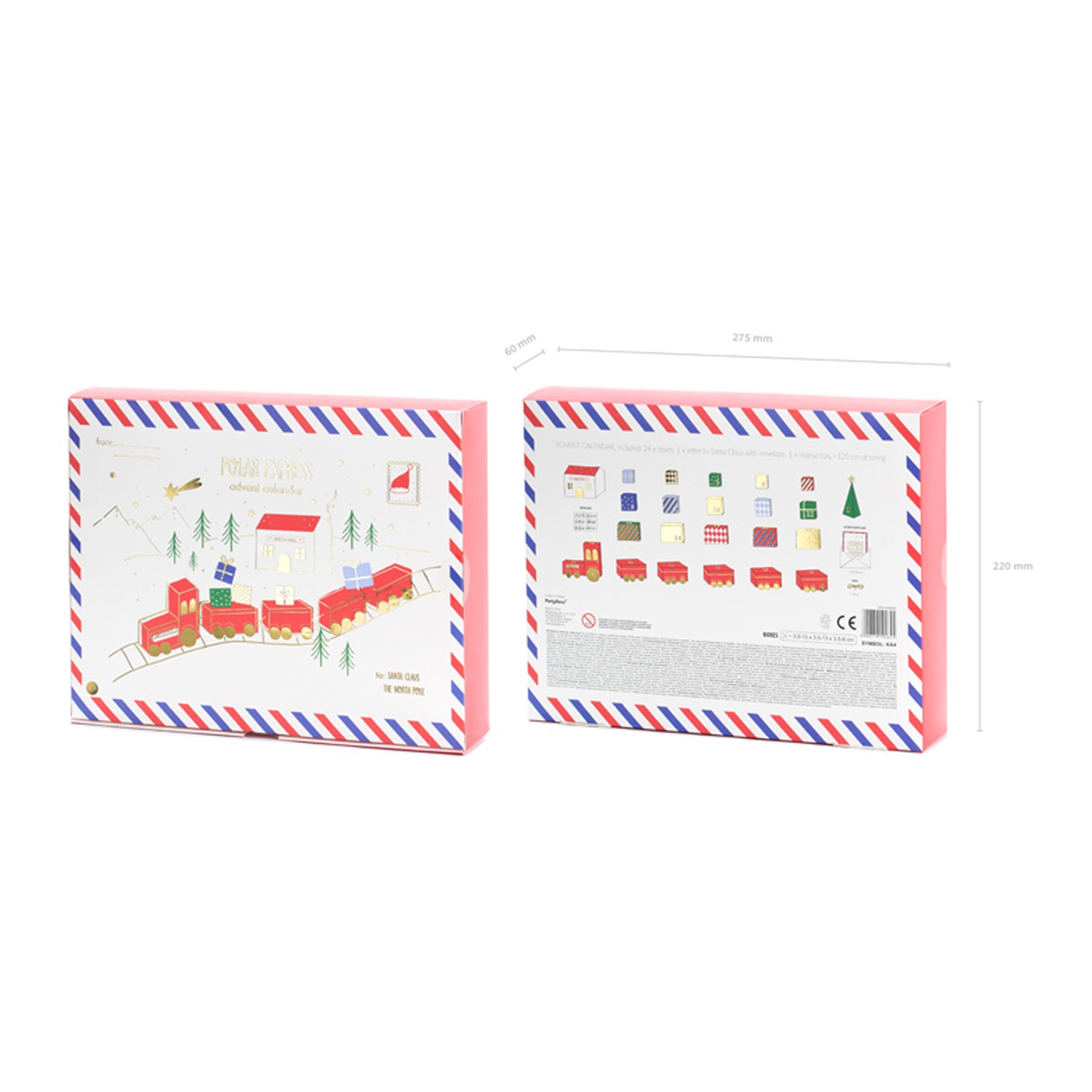Il set contiene 24 scatoline con stampa metallizzata colorata e dorata, da assemblare per realizzare un grazioso trenino natalizio tramite un filo dorato di circa 50 cm, e una lettera a Babbo Natale con busta e istruzioni. Un'idea regalo davvero carina per grandi e piccini!