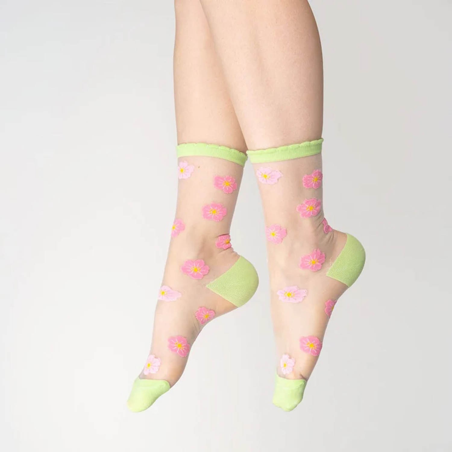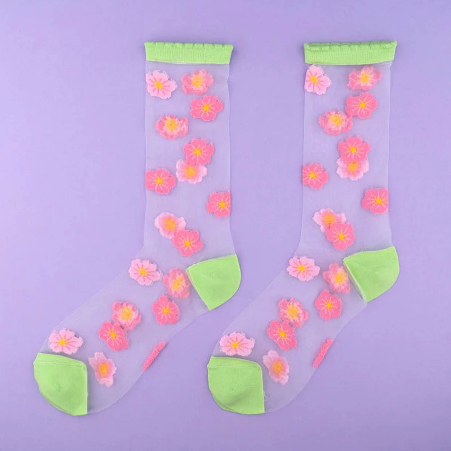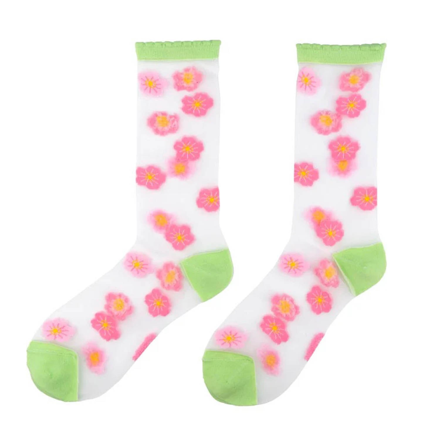 Calzini trasparenti con motivo sakura, la piccola bellezza rosa che ricopre i fiori di ciliegio in primavera. Questi calzini sono un modo perfetto per decorare le caviglie, con la graziosa balza verde lime sul bordo. Un vero e proprio piccolo giardino ai tuoi piedi!