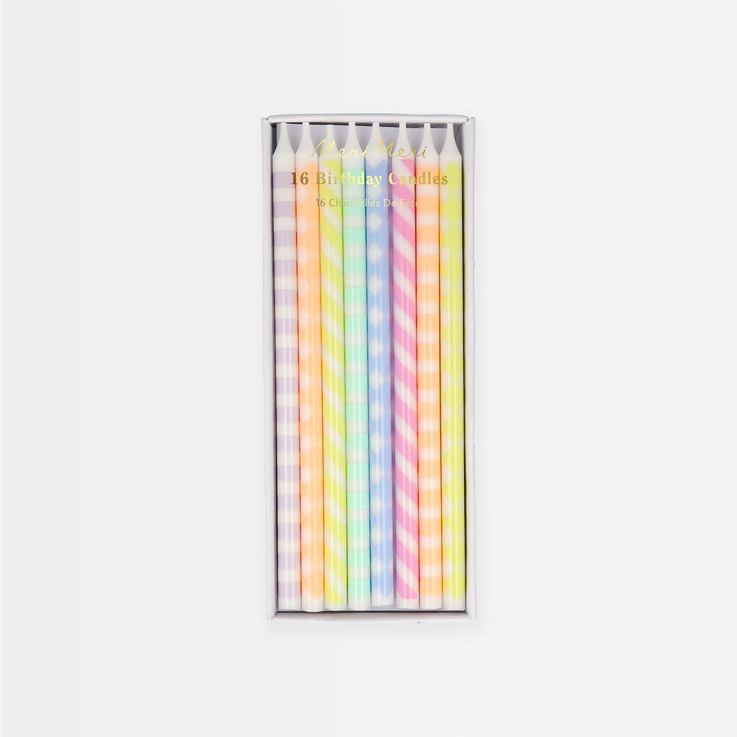 Aggiungi un tocco di colori pastello alla tua torta di compleanno con questo meraviglioso set di candeline Meri Meri decorate con fantasie a righe e a rombi. Ideali per feste di compleanno o baby shower. Confezione da 16 in 8 disegni