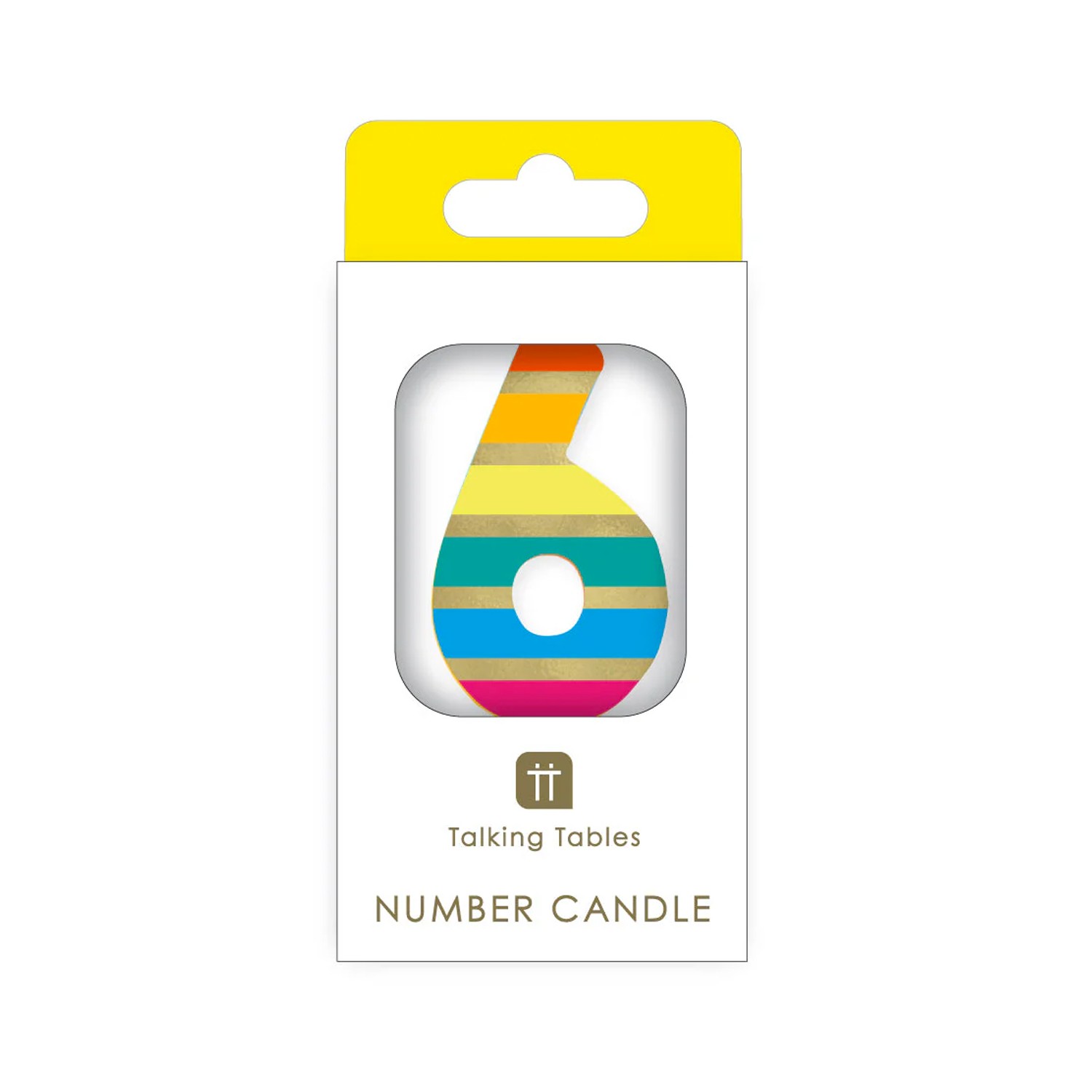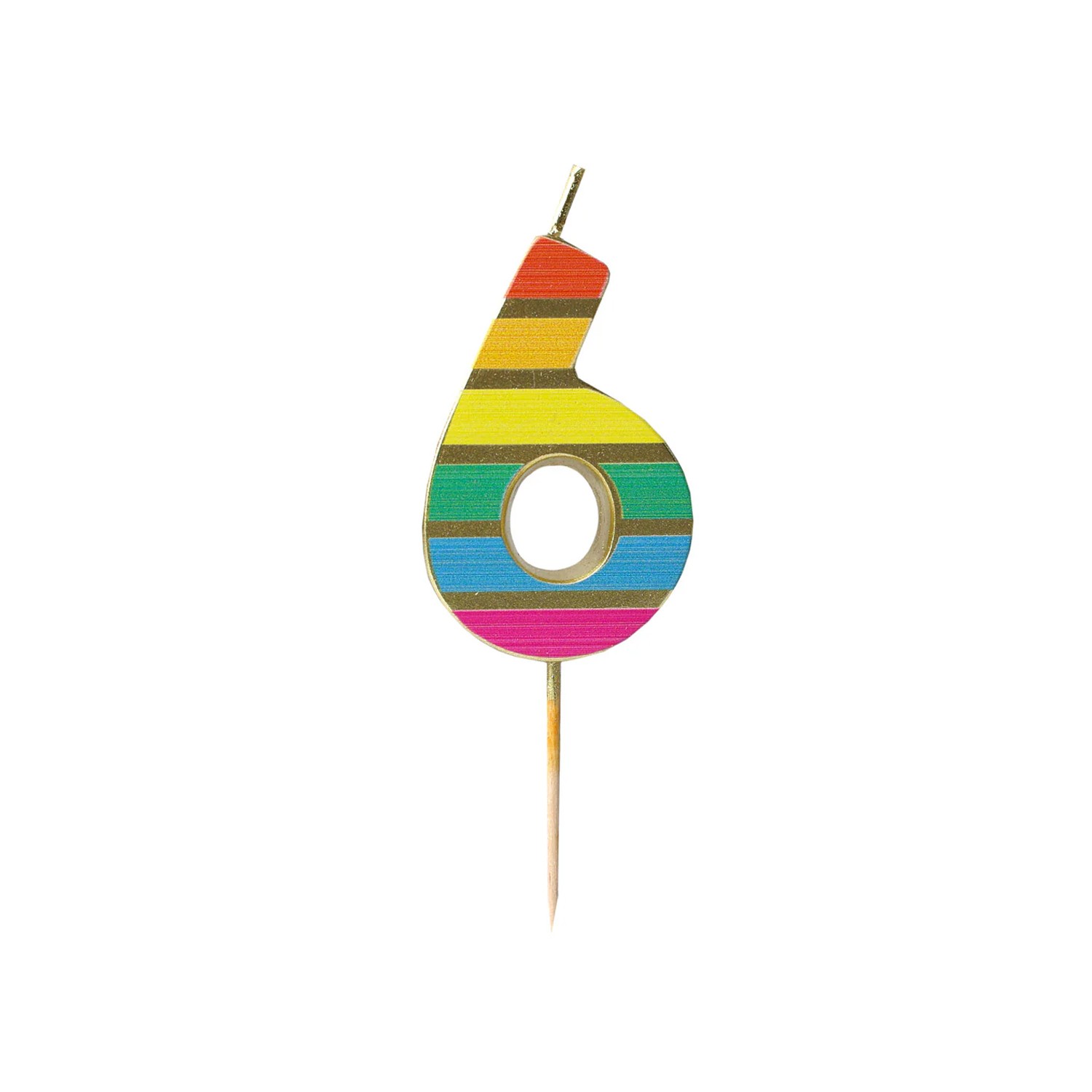 Aggiungi un tocco acceso alla tua torta di compleanno con questa candelina decorativa dai colori arcobaleno con finiture dorate a forma di numero 6, perfetta per una festa di compleanno o un anniversario di matrimonio, adatta a tutti, grandi e piccini! Abbinala agli altri numeri a tema per ottenere l'età desiderata.