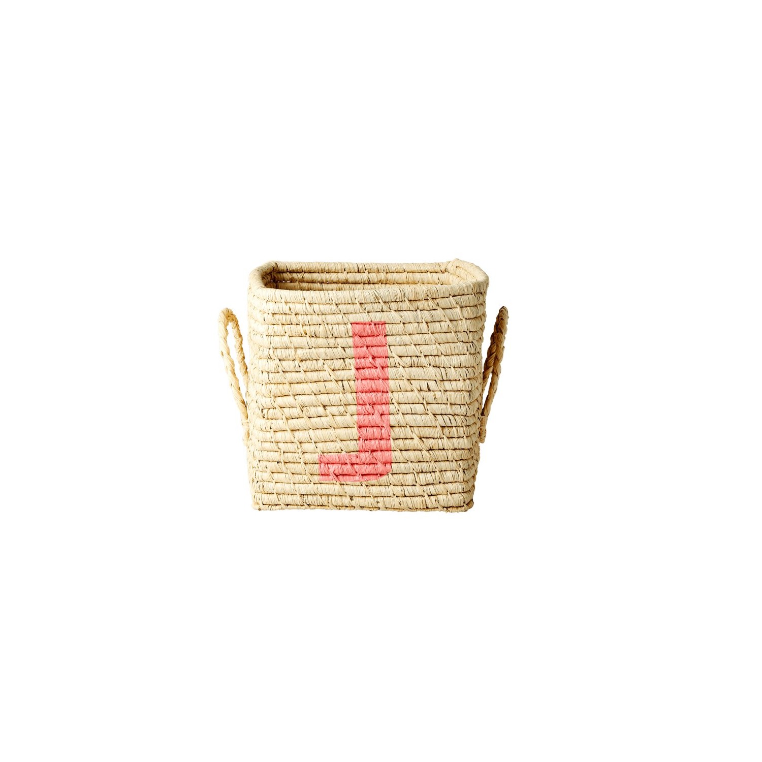 Cesto portaoggetti quadrato - formato small - in rafia natural con lettera J rosa dipinta sul davanti. Ideale per riordinare le camerette dei più piccini con un simpatico tocco di colore.