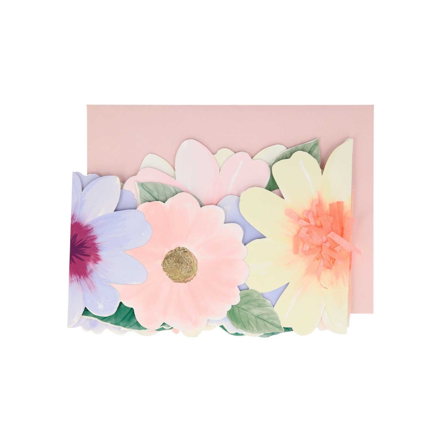 Questo grazioso biglietto di auguri a concertina presenta bellissimi fiori e foglie, è perfetto anche come decorazione per le tue feste a tema floreale. Dettagli dorati. Busta coordinata rosa inclusa nella confezione. Realizzato con carta ecologica.