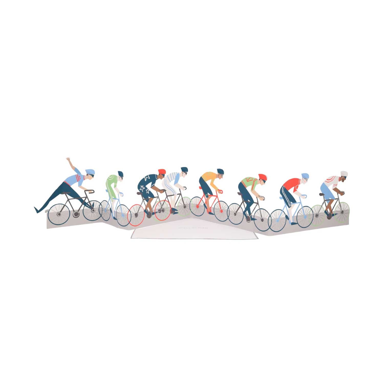 Le persone che adorano andare in bicicletta ameranno questa favoloso biglietto d'auguri a tema ciclismo che alla sua apertura presenta una serie di ciclisti in fila durante una gara. Ideale per le tue feste e come carta da decoro. Stampa e dettagli del foglio in argento lucido su entrambi i lati. Busta coordinata inclusa nella confezione. Realizzato con carta ecologica.