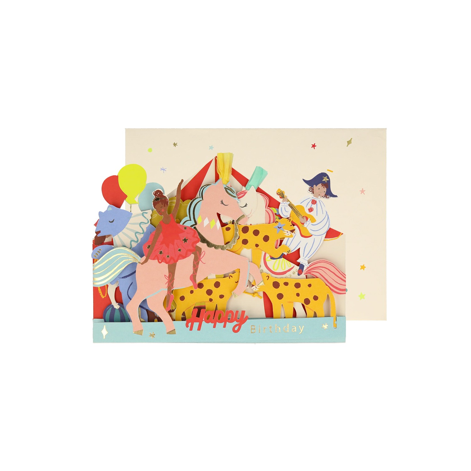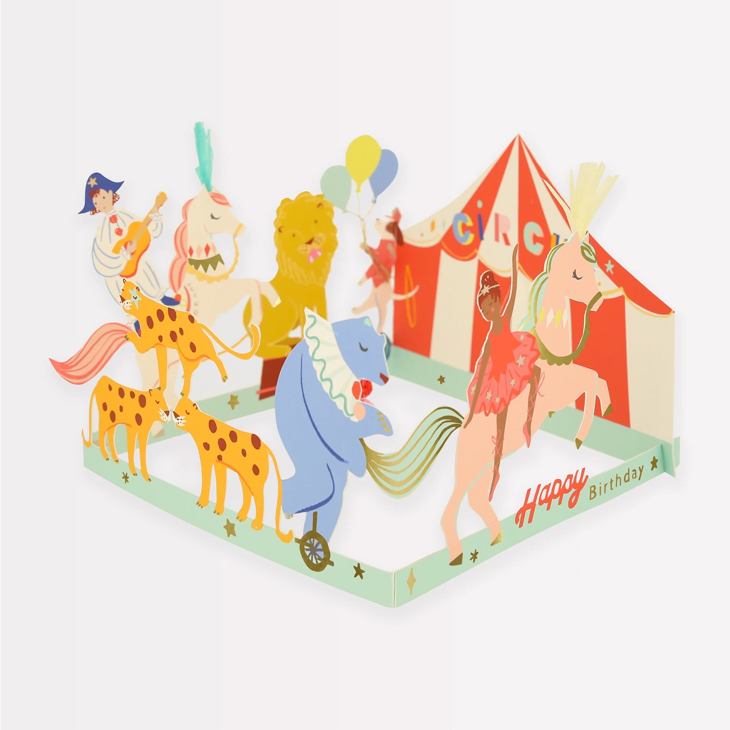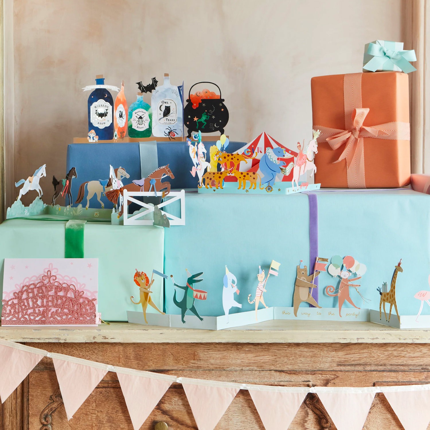 Questo simpatico biglietto a fisarmonica a tema circense ha molti dettagli e abbellimenti tra cui nappe a pennacchio di carta velina gialla e menta sui cavalli, pompon rosa/rossi sull'orso e coda in corda annodata gialla sul leone. I palloncini sono attaccati a cordicine color oro metallizzato.