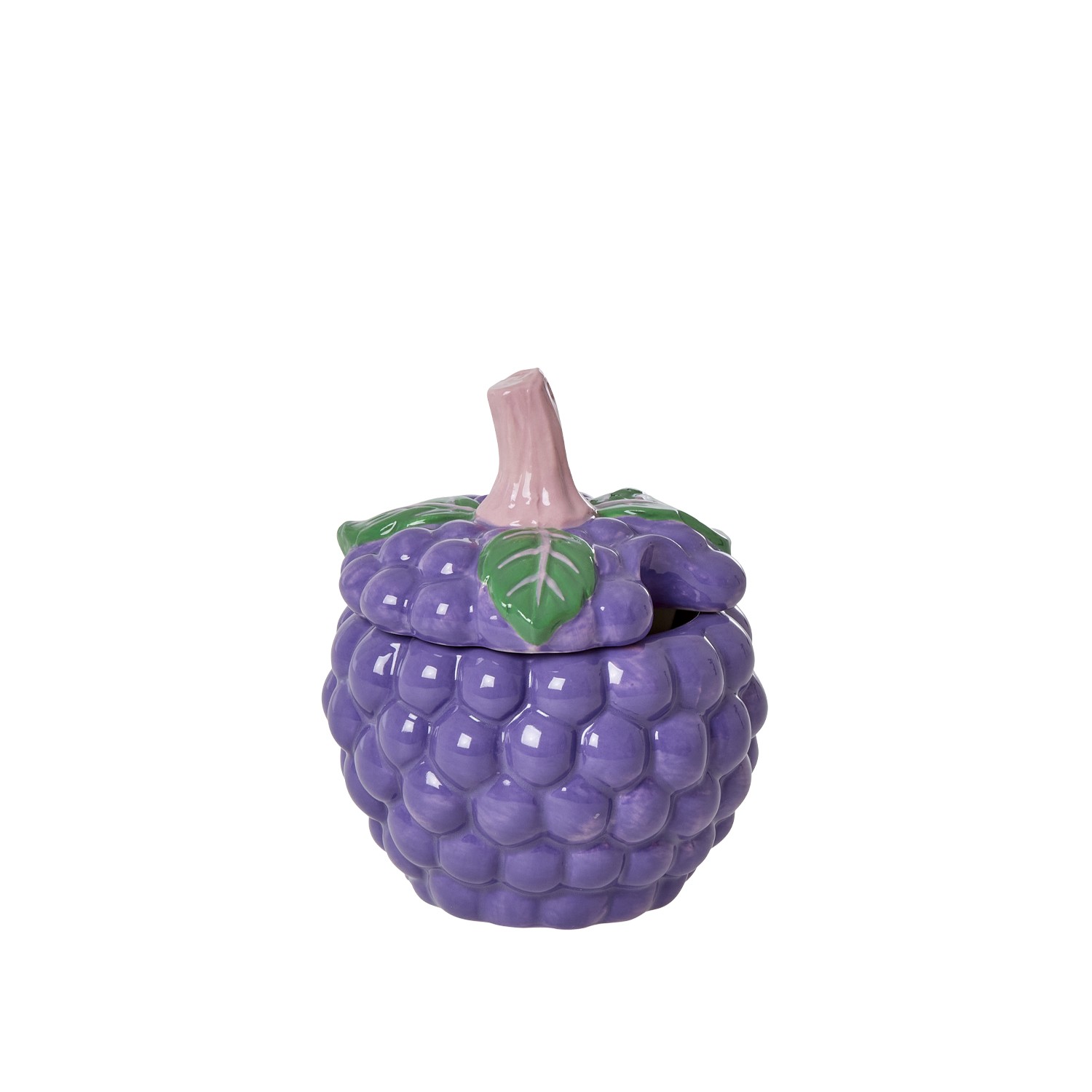 Piccolo barattolo in ceramica di colore viola a forma di grappolo d'uva con coperchio, ideale per contenere piccoli oggetti o anche marmellate, dando un bel tocco di colore e di design alla tua cucina.