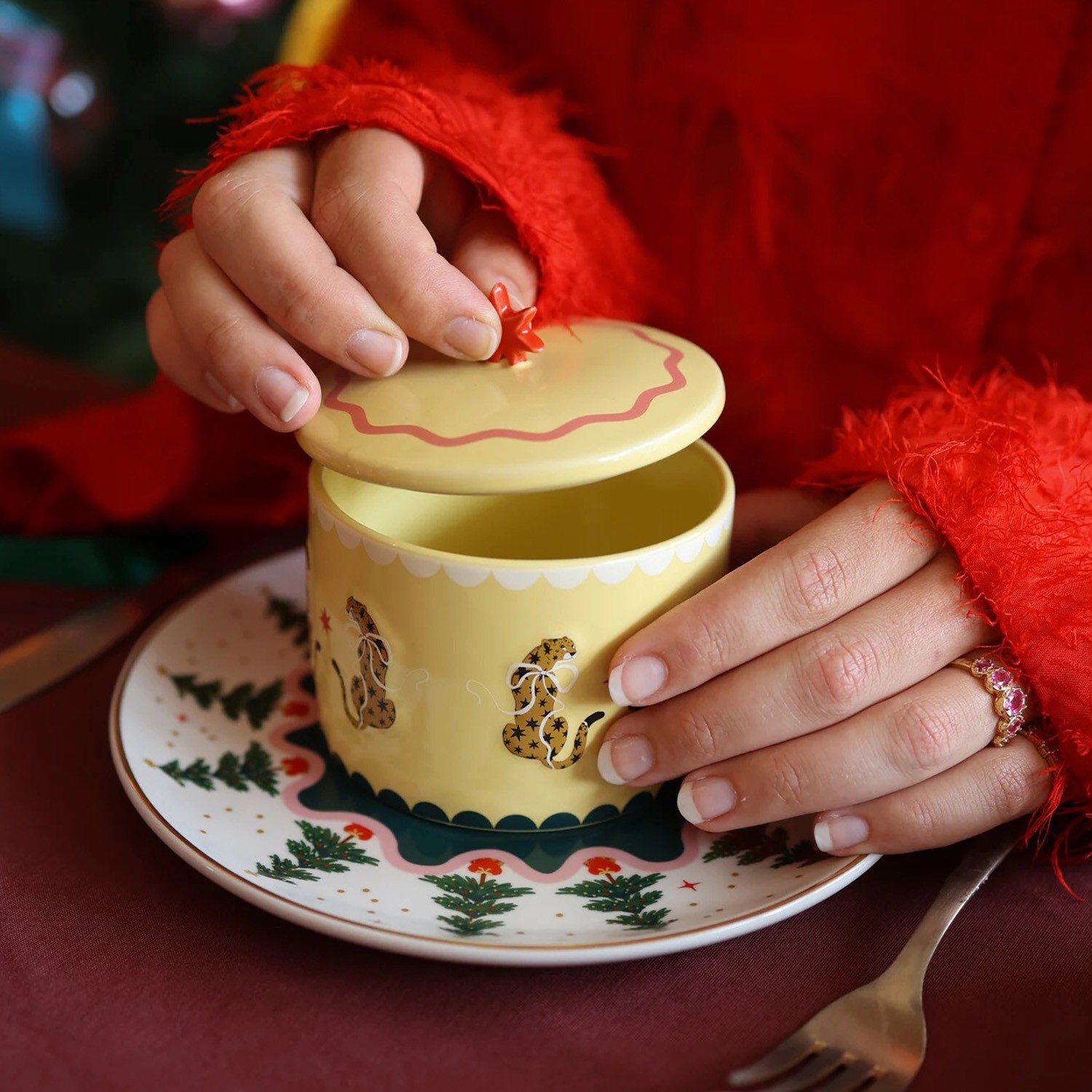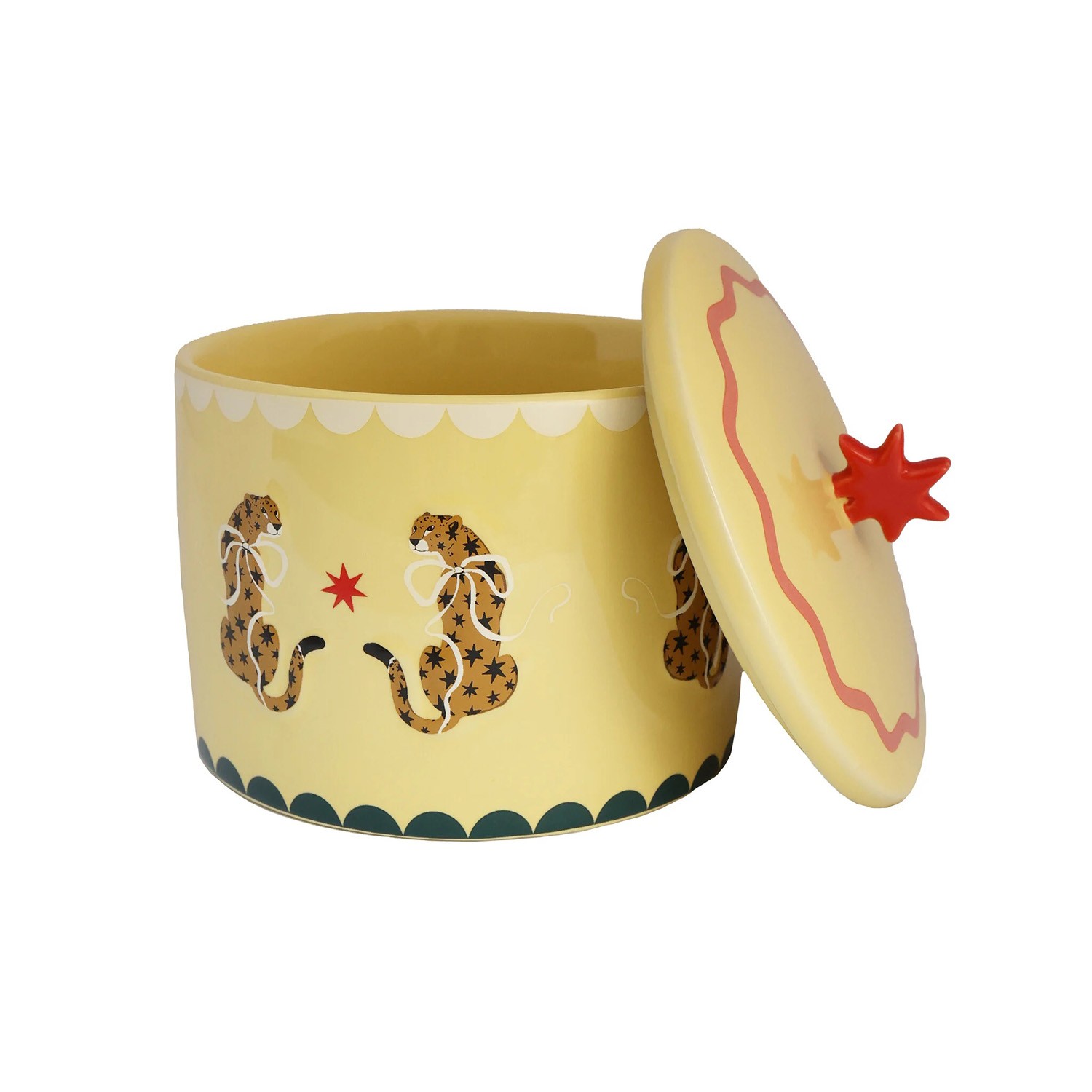 Questo grazioso barattolo realizzato in ceramica smaltata gialla con fantasia di leopardi dotato di pratico coperchio, è perfetto per contenere sale o zucchero donando un tocco allegro alla tua tavola, o semplicemente come porta gioie.