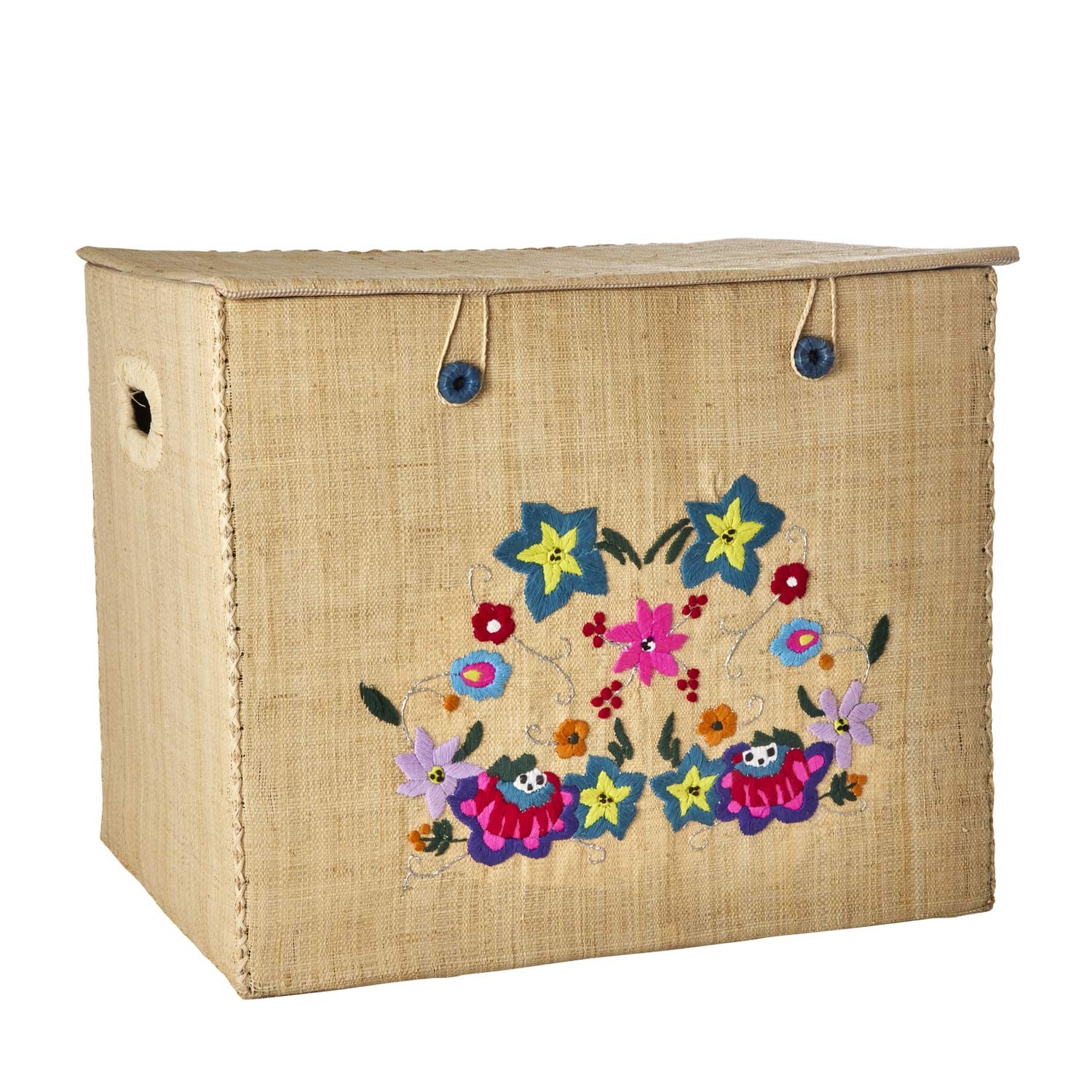 Cesta rettangolare realizzata in rafia natural di colore beige con graziosa decorazione floreale ricamata a mano e pratica chiusura con lacci e bottoni. Dotata anche di comode maniglie laterali per essere portata ovunque, ideale come portaoggetti per riordinare la stanza o per contenere il bucato. Formato large. Acquistabile anche nella dimensione più piccola di colore viola.