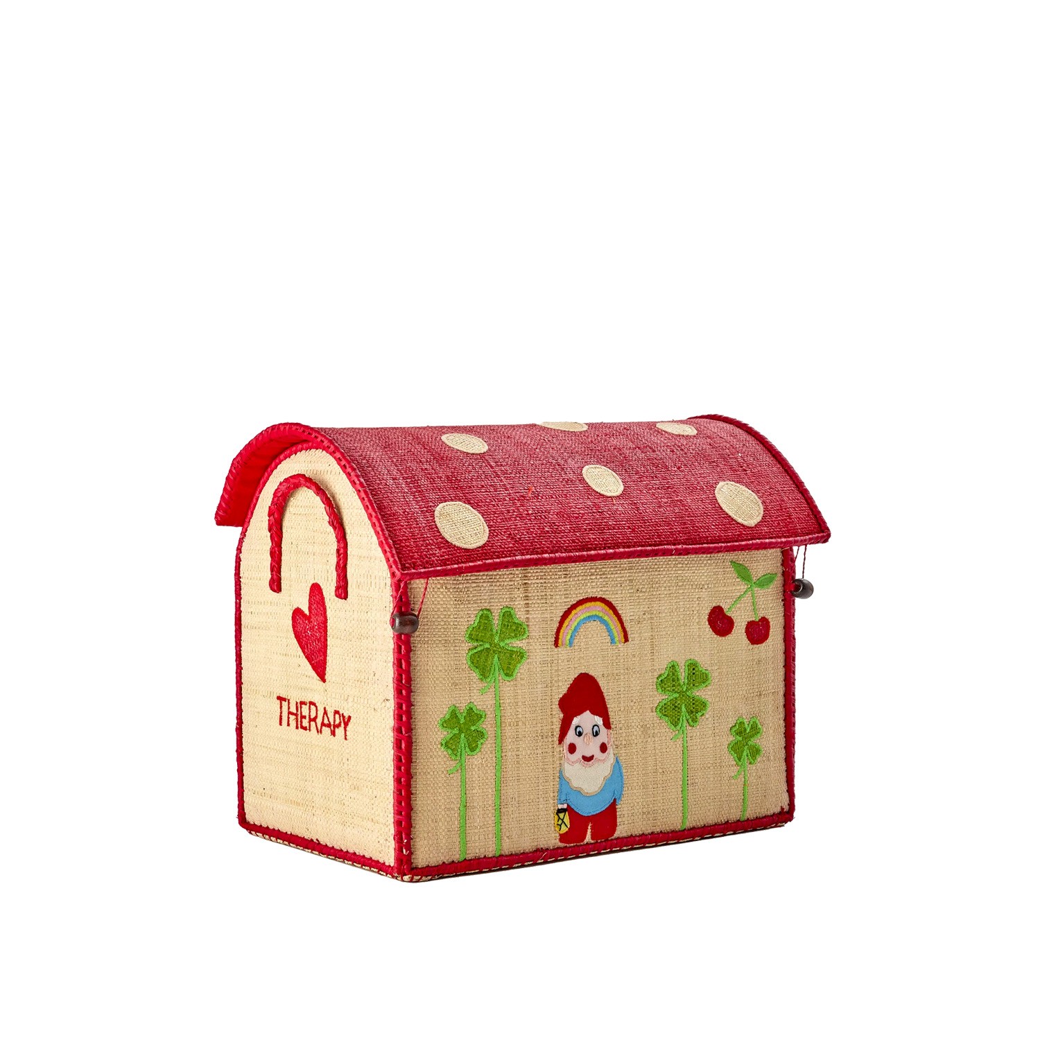 Coloratissima cesta portagiochi in rafia naturale color beige della nuova collezione Rice x Love Therapy. Una collezione che celebra la creatività, i colori e la magia quotidiana! Questa cesta portagiochi a forma di casetta è ricamata con un simpatico gnomo, pois e quadrifogli portafortuna ed è perfetta per riporre giochi, libri e coperte. Love Therapy nasce dalla visione del fondatore Elio Fiorucci di infondere "Amore" come valore attivo nella moda e nel design, con uno stato d'animo divertente e amorevole.