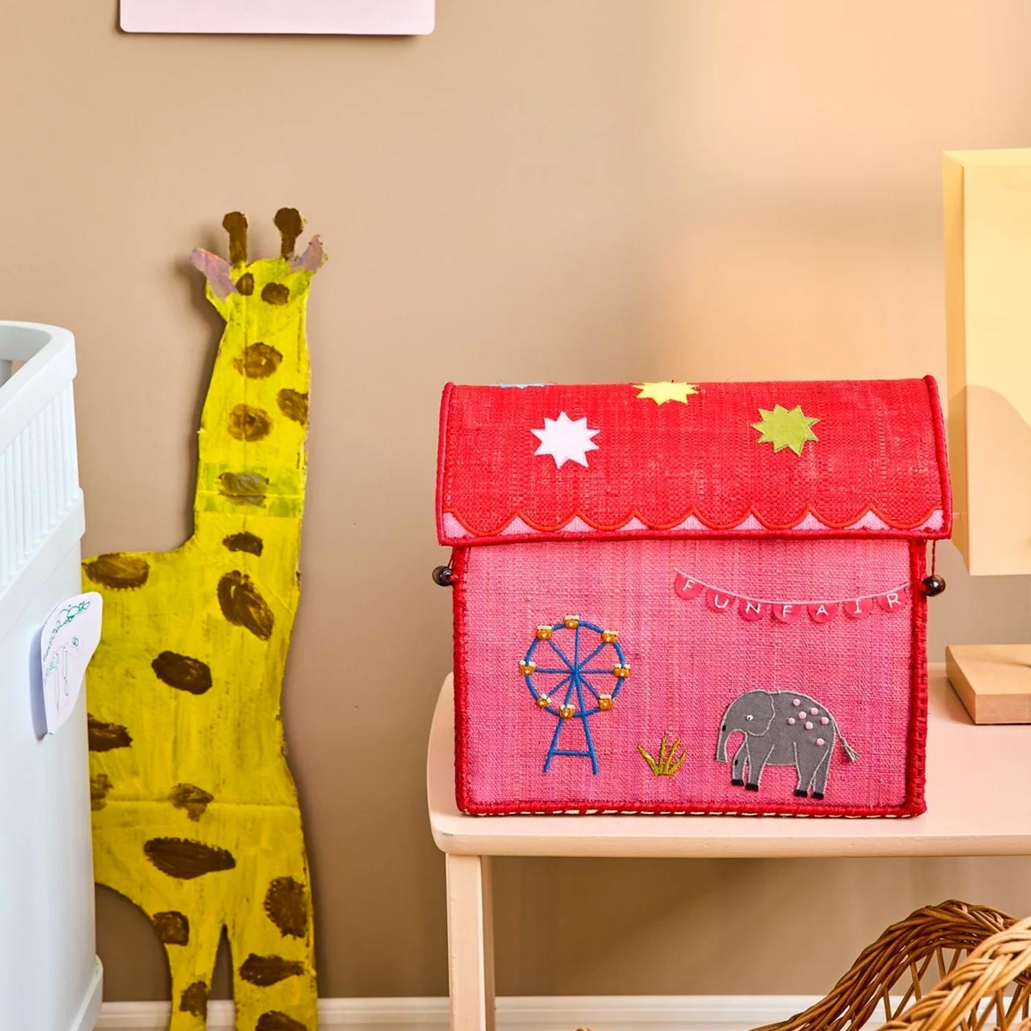Cesta porta giochi a forma di casetta realizzata in rafia rosa fluo dalla simpatica fantasia a tema parco divertimento ricamata a mano con elefantino e ruota panoramica, dotata di un tetto-coperchio rosso con stelle e di pratici manici. Questi contenitori sono perfetti per riordinare la stanza dei bambini, o per essere riposti nel soggiorno e nel corridoio come porta scarpe e vestiti.
