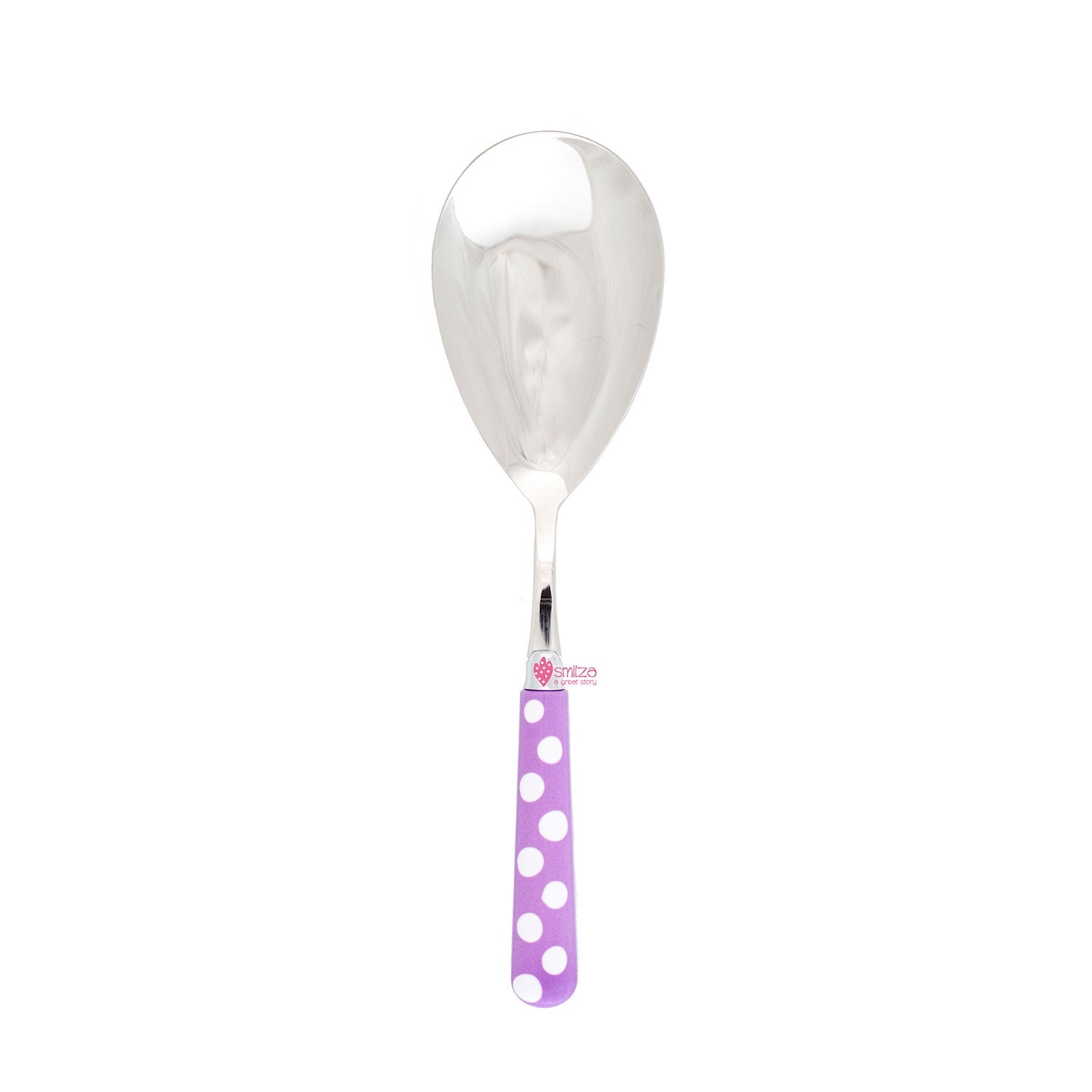 Cucchiaio da riso in acciaio inox 18/10 con manico in resina di colore viola decorato a pois.