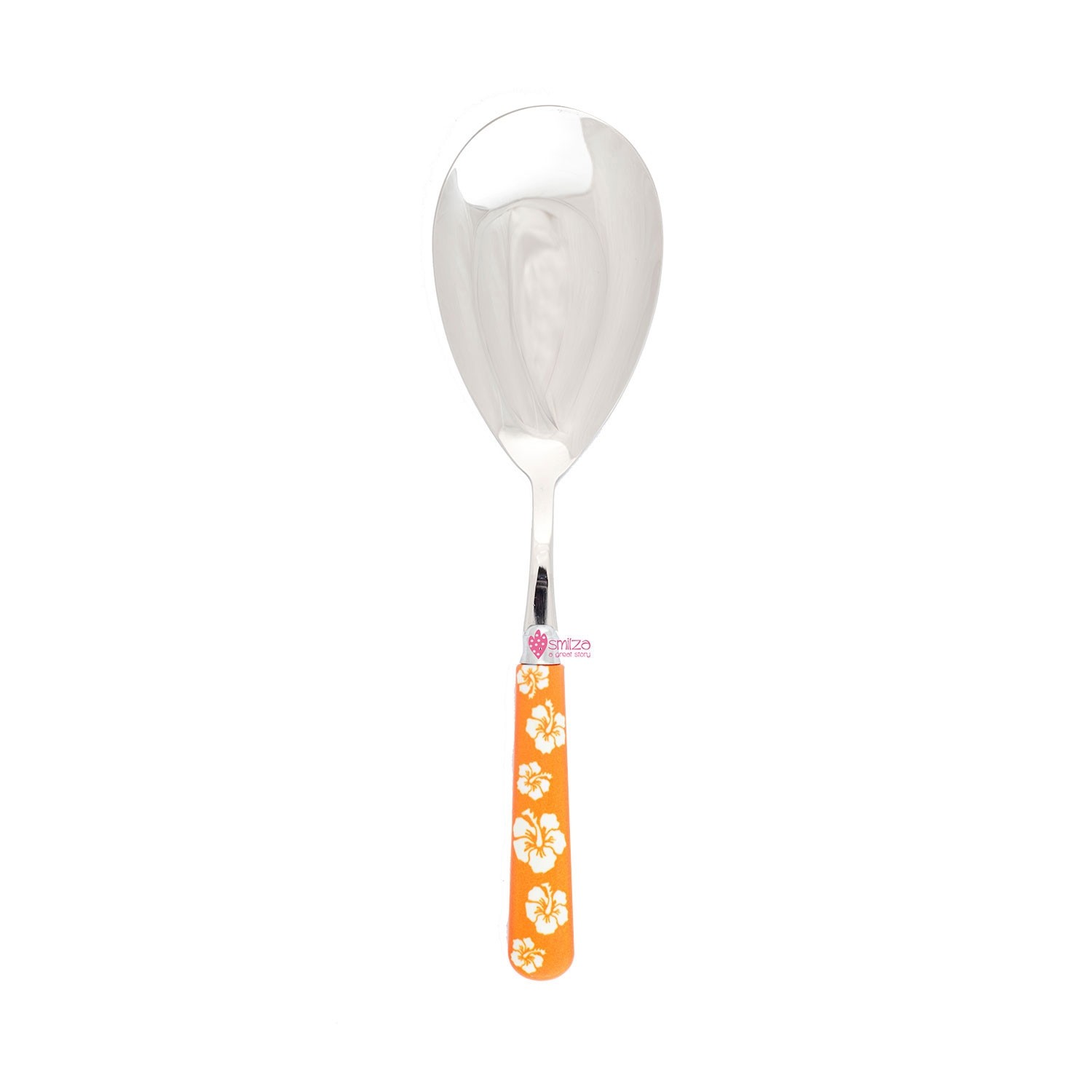 Cucchiaio da riso in acciaio inox 18/10 con manico in resina di colore arancione decorato con fiori bianchi.