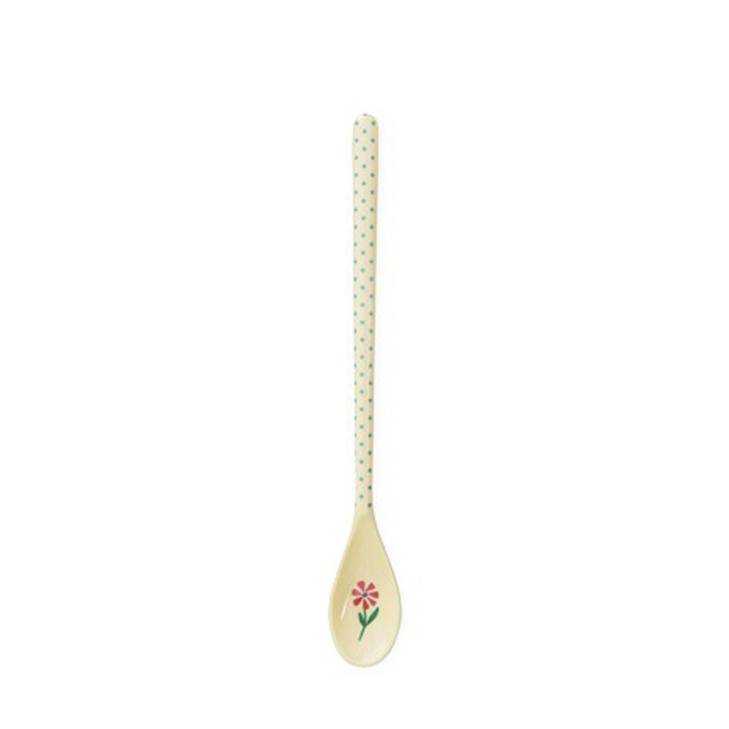 Cucchiaino lungo in melamina color crema con graziosa stampa a pois azzurri disegnata sul manico. Ideale per sorseggiarsi un bel bicchiere di latte o per un aperitivo pieno di colore, desiderando l'estate!