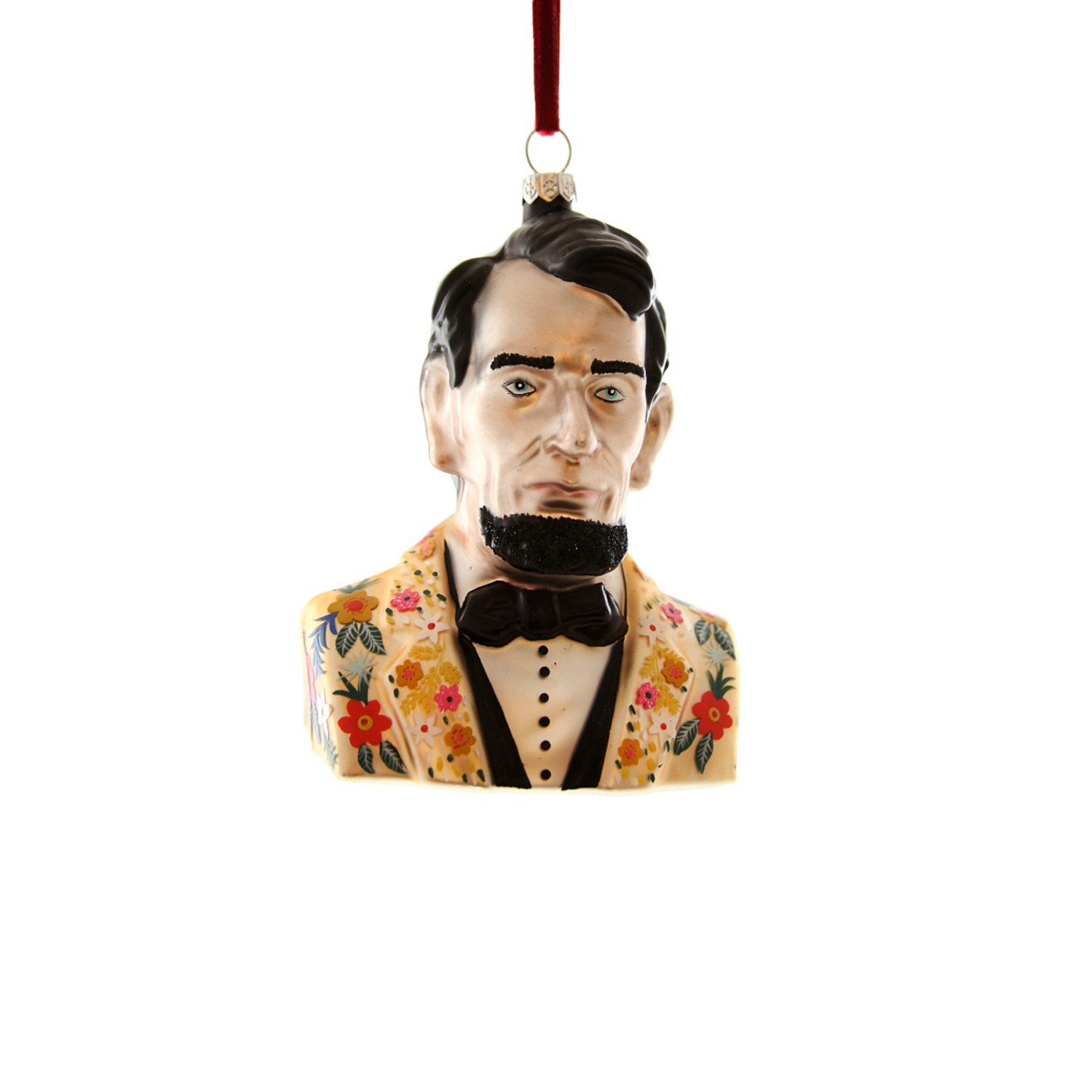 Decorazione in vetro soffiato dipinta a mano raffigurante Abramo Lincoln in versione elegante hawaiano, ideale da appendere all’albero di Natale o in qualsiasi punto della casa per darle un bel tocco di colore.