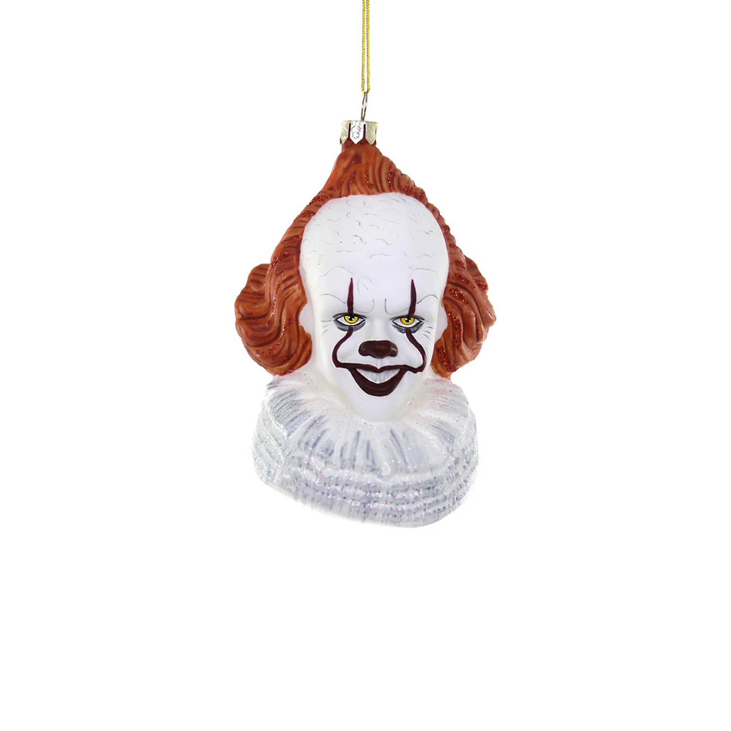 Una decorazione in vetro soffiato glitterato dipinta a mano a forma del terrificante pagliaccio Penny Wise, perfetta da appendere all’albero di Natale o in qualsiasi punto della casa.
