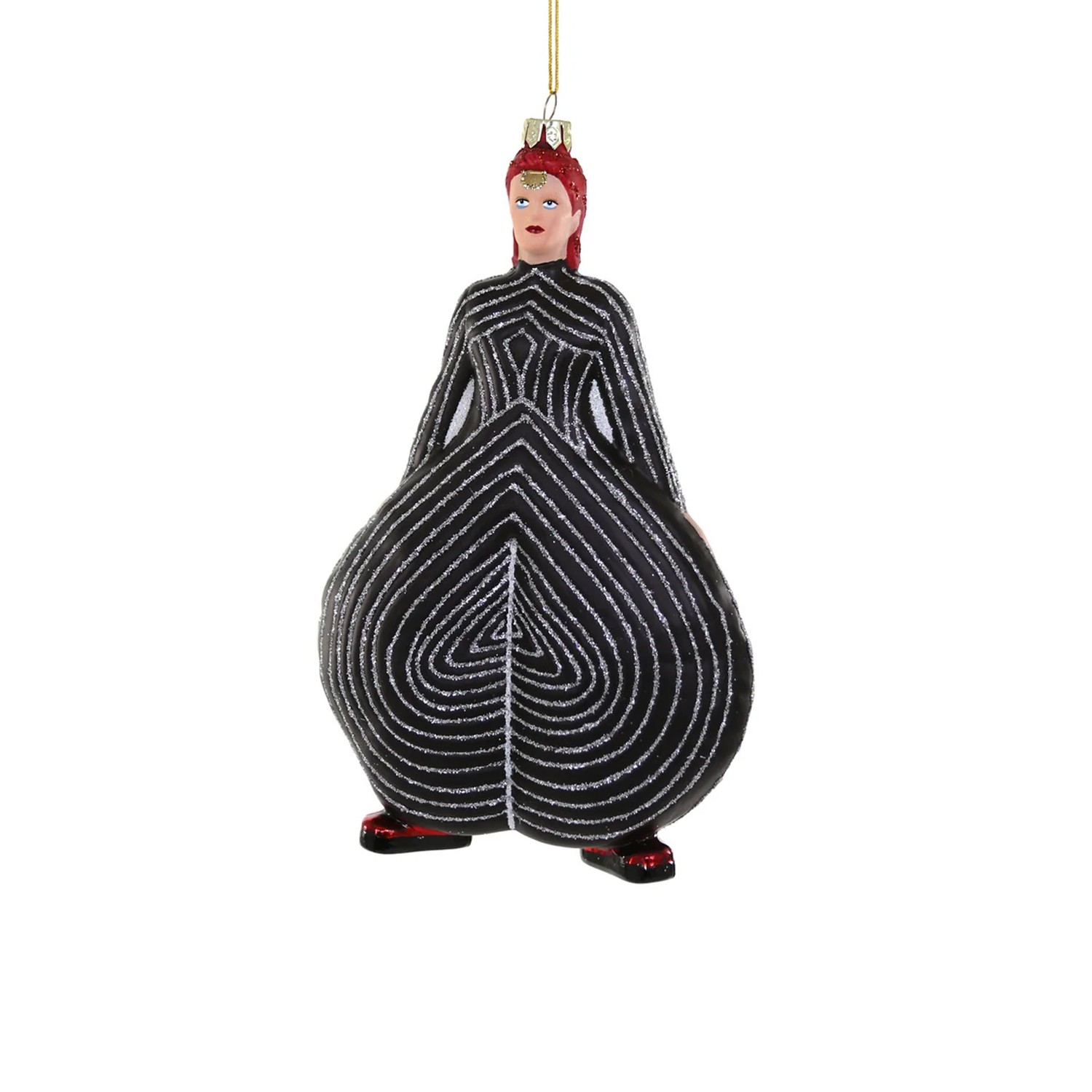 Una decorazione in vetro soffiato glitterato dipinta a mano a forma del famoso cantante David Bowie in versione Ziggy Stardust, perfetta da appendere all’albero di Natale o in qualsiasi punto della casa, per aggiungere un tocco glamour.