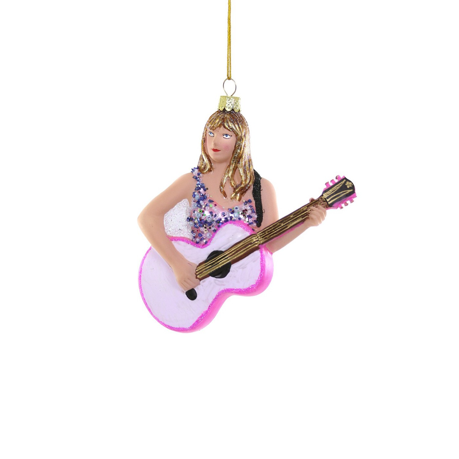 Una pregevole decorazione in vetro soffiato glitterato dipinta a mano raffigurante l'iconica cantante americana Taylor Swift mentre suona la chitarra, perfetta da appendere all’albero di Natale o in qualsiasi punto della casa, per aggiungere un tocco glamour.