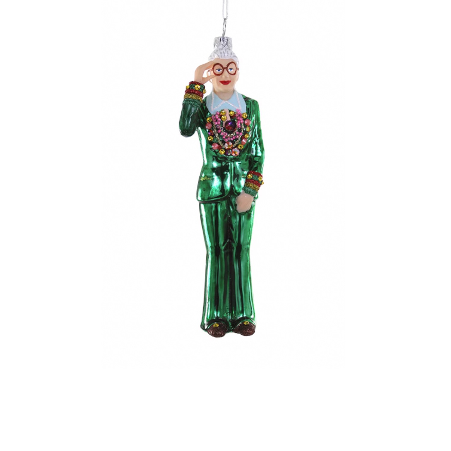 Questa decorazione in vetro soffiato è un vero omaggio allo stile e alla personalità. Rappresenta l'iconica Iris Apfel, la "starlet geriatrica" più amata della moda, trasformata in un prezioso addobbo natalizio che non passerà certamente inosservato. Più che una semplice decorazione, è un pezzo di design che porta sul tuo albero di Natale lo spirito vibrante e l'audacia di una vera leggenda del fashion. Fedele alla filosofia del "More is more", l'addobbo è impreziosito da una cascata di collane multicolor e gioielli scintillanti applicati in rilievo su un elegante completo verde brillante. Può essere utilizzata come dettaglio decorativo in uno studio o in una camera da letto durante tutto l’anno.