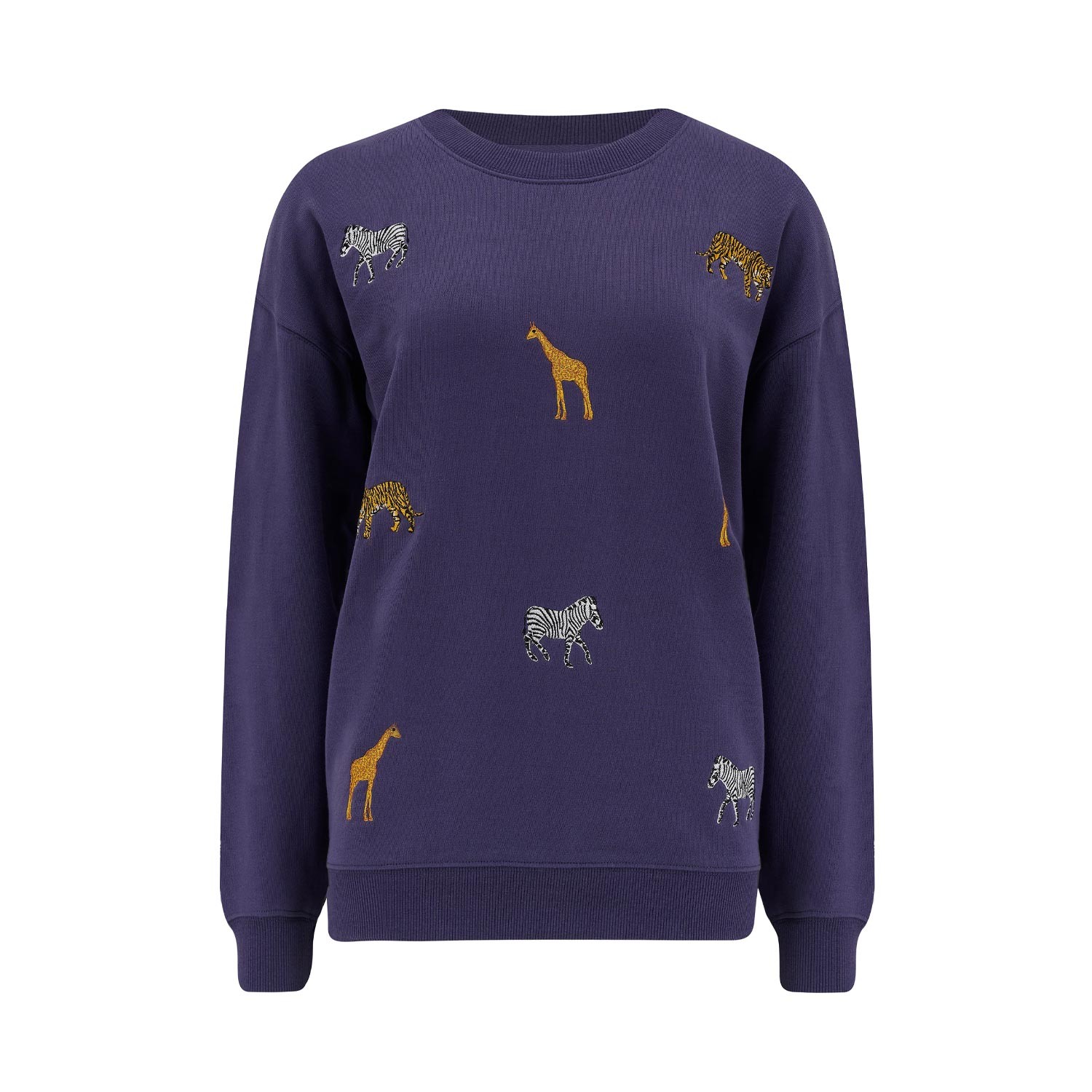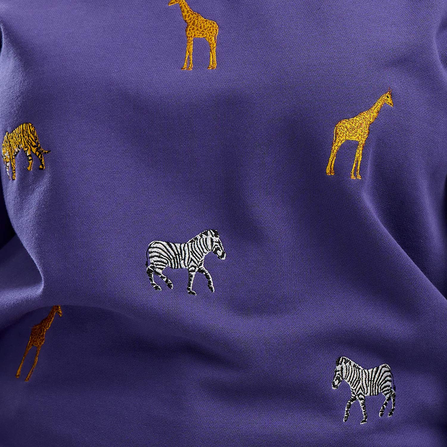 Questa felpa girocollo ha una vestibilità semi-rilassata, colletto e polsini a coste e un interno morbidissimo, e presenta una fantasia con animali da safari ricamati su una base blu navy tendente al viola. Composizione: 100% Cotone biologico.