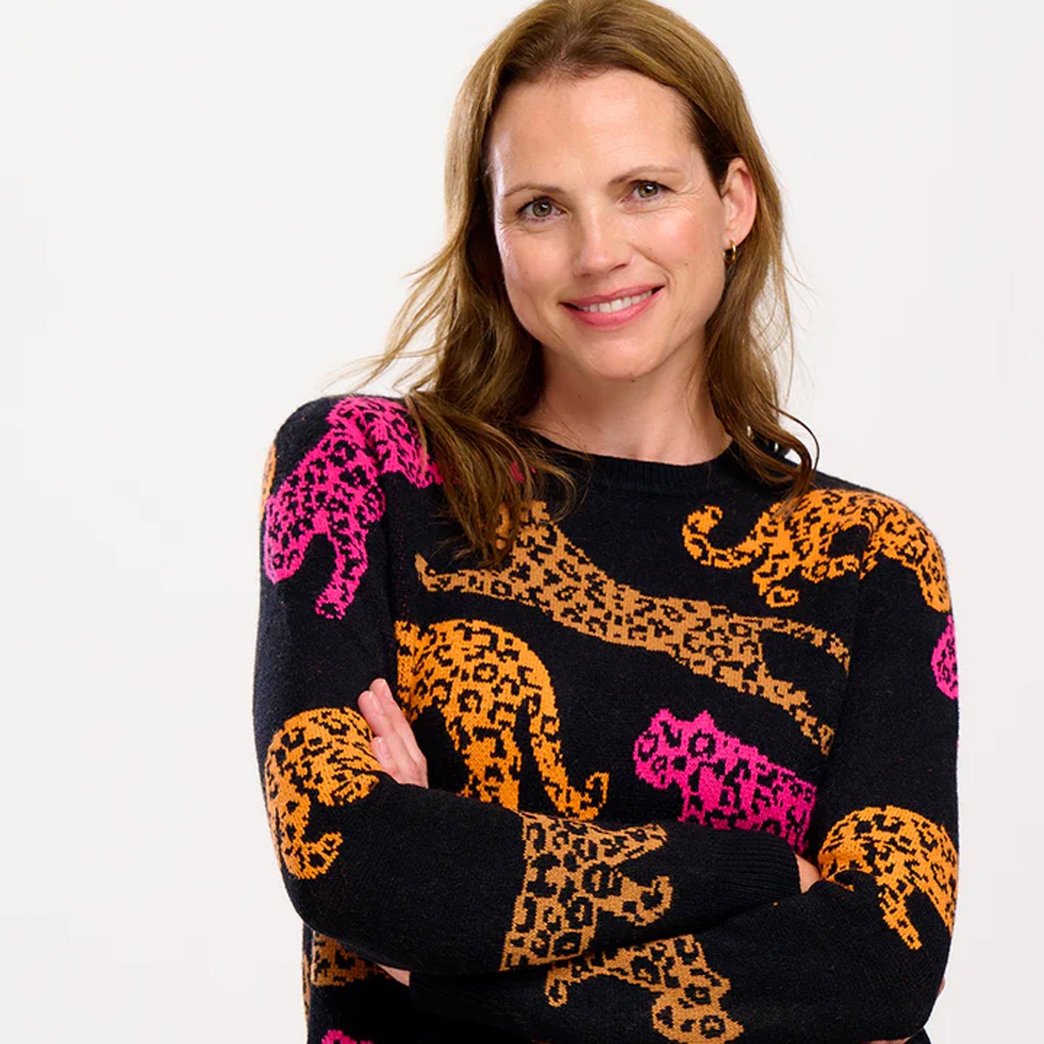 Maglioncino donna in maglia doppia, fitta e accogliente, una sensazione più pesante ma una consistenza molto leggera del filato. Questo maglione ha un taglio più corto e squadrato, con scollo rotondo, manica lunga e colletto e polsini a coste. Presenta una fantasia animalier con leopardi colorati su sfondo nero.