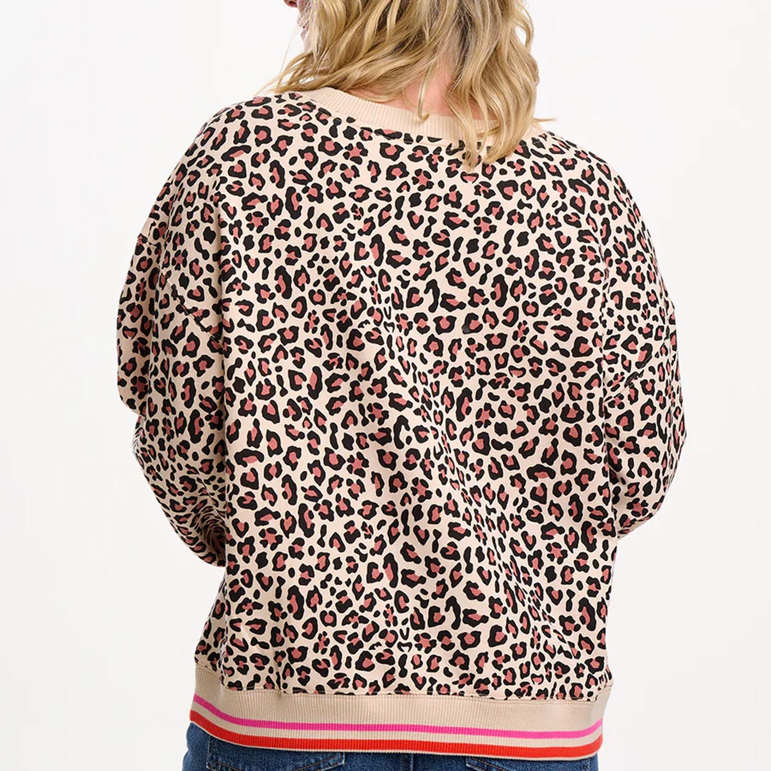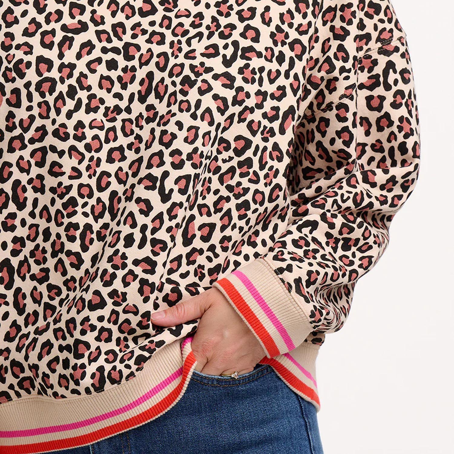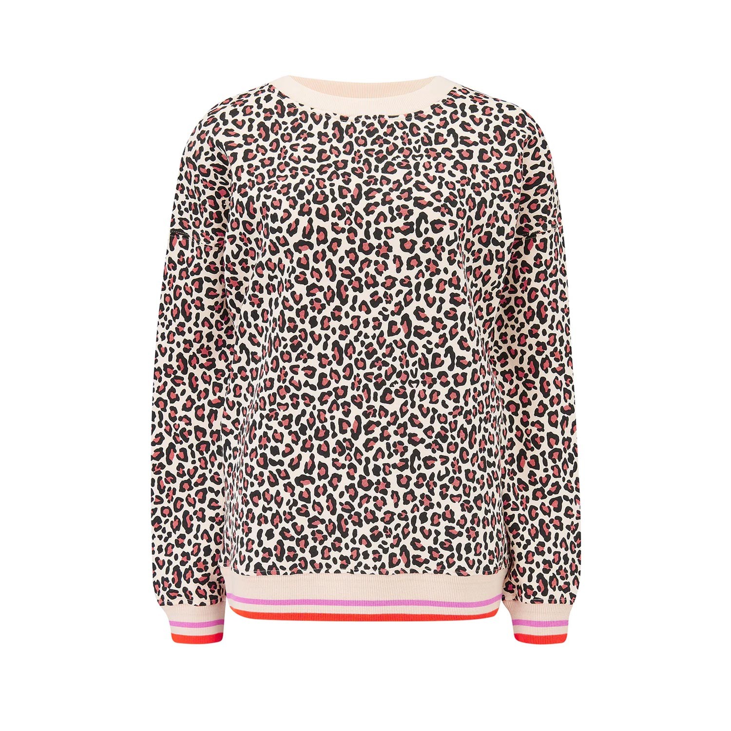 Questa felpa girocollo ipoallergenica presenta una stampa leopardata dai toni naturali, in contrasto con i bordi a coste a righe su polsini e orlo in vivaci colori corallo e rosa. Le spalle scese e la vestibilità oversize creano una silhouette rilassata, mentre l'interno super morbido la rende perfetta per tutto il giorno. Abbinala a jeans o joggers per un look casual e casual.