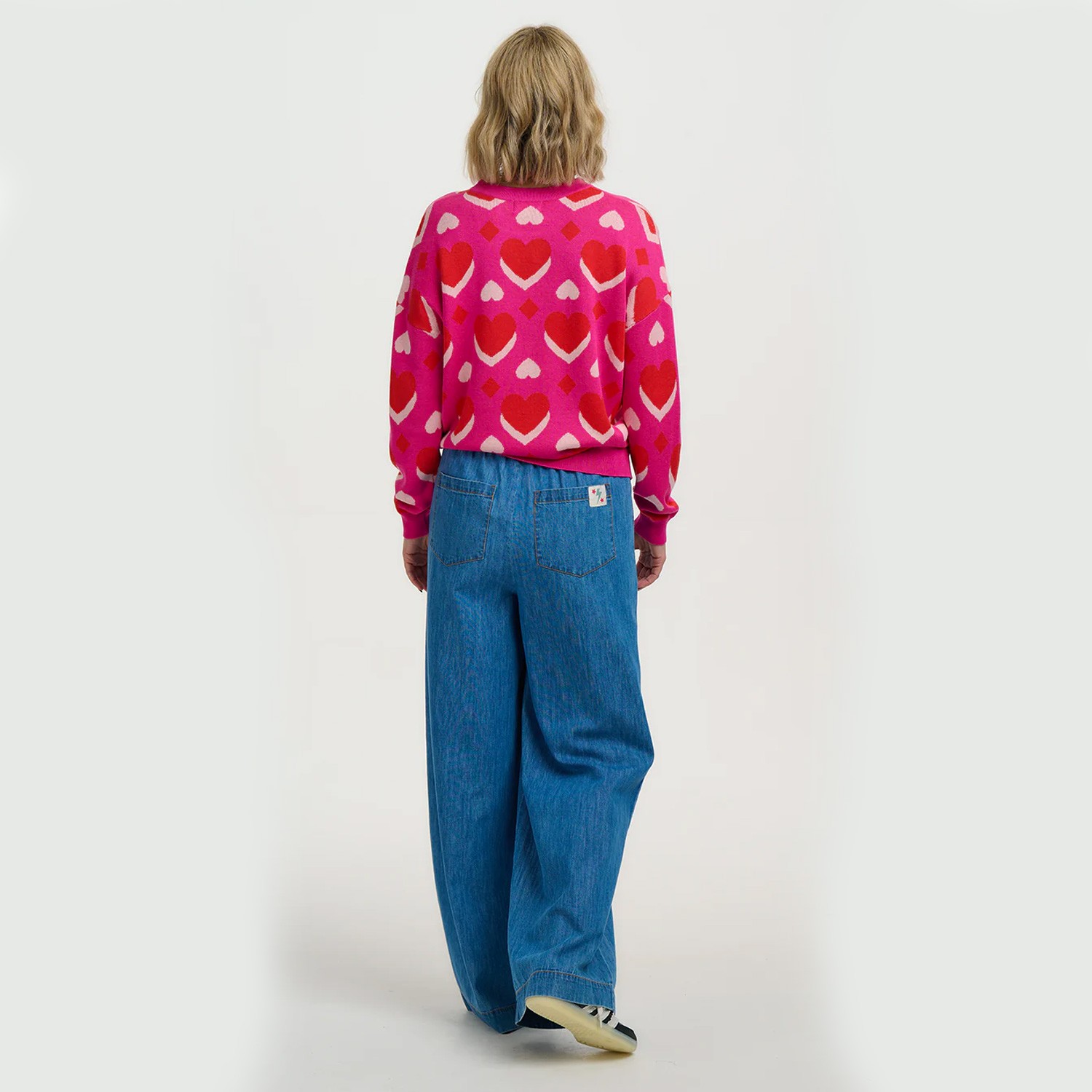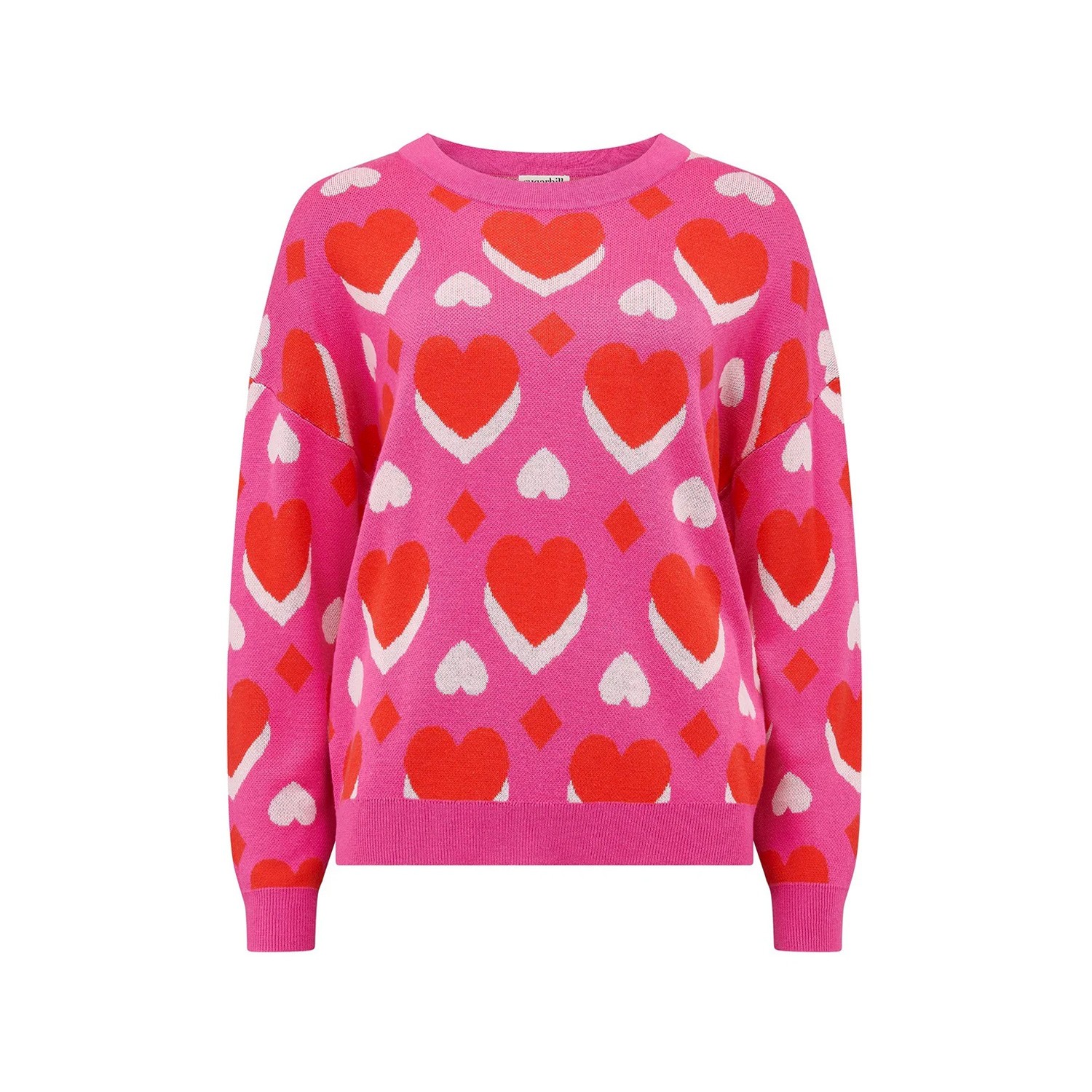 Questo maglione è progettato per offrire comfort e stile, con la sua vestibilità comoda e squadrata. Con spalle scese e lunghezza leggermente più corta, offre una silhouette rilassata e facile da indossare. Realizzato in un leggero misto cotone e viscosa, ma lavorato a doppia maglia per una maggiore comodità. Il design accattivante presenta cuori rossi vivaci con ombre che si ripetono su uno sfondo rosa, accentuato da piccoli rombi per un tocco giocoso al tuo look quotidiano.