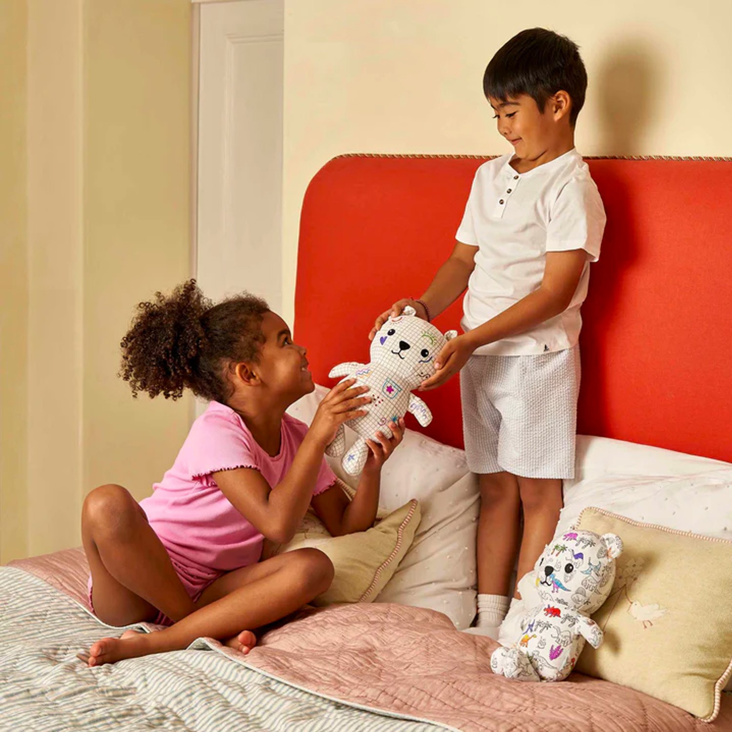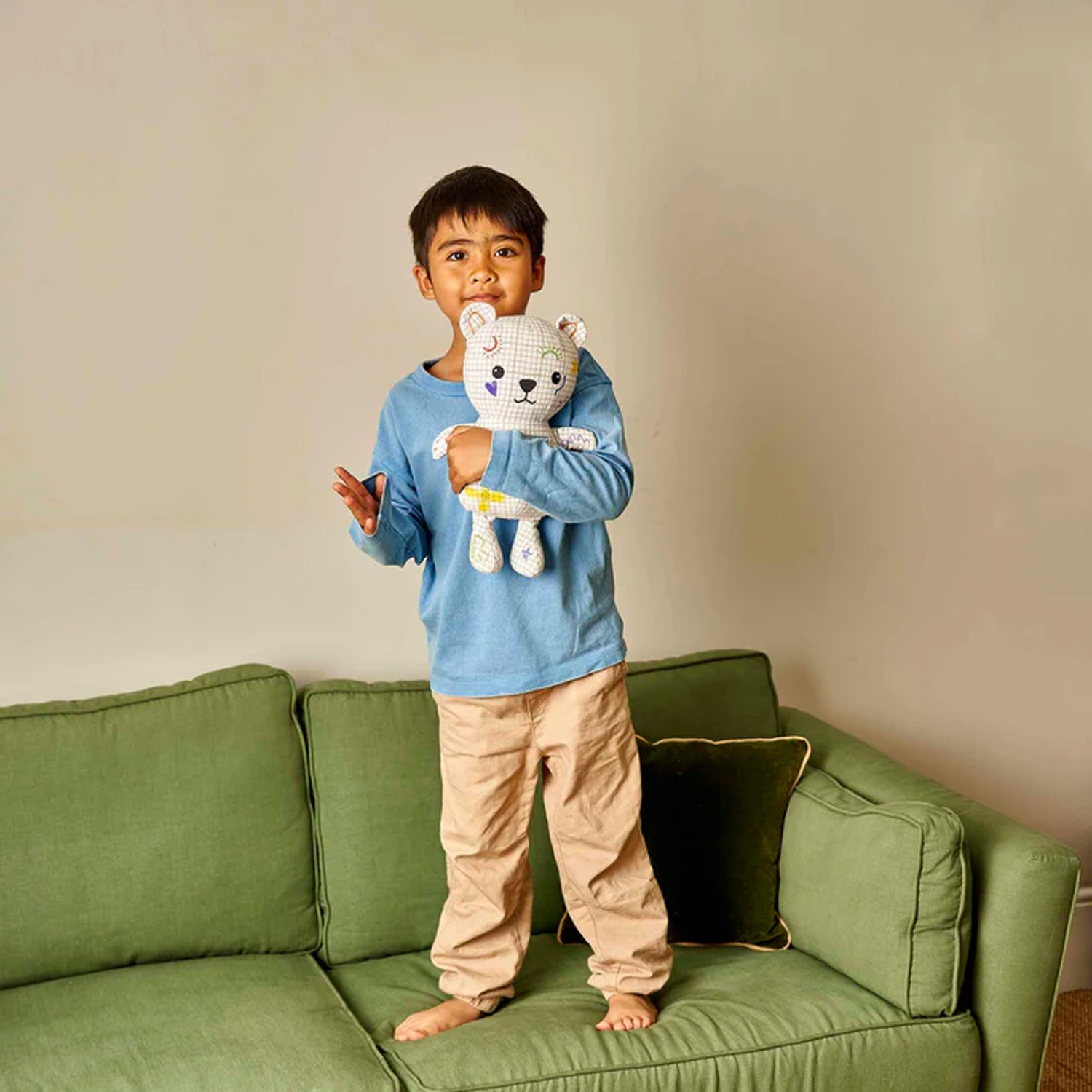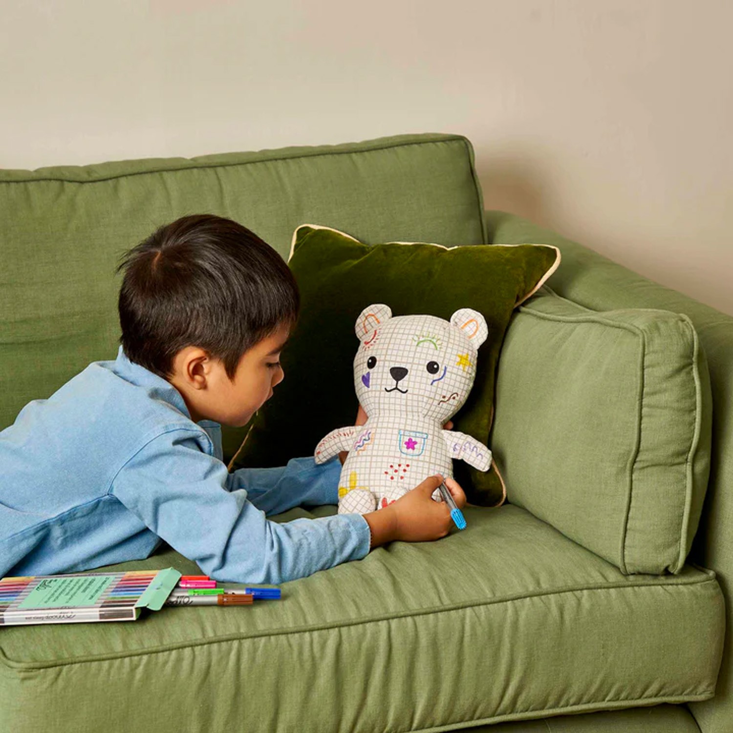 Il motivo scarabocchiato di Artie Bear vi permette di sperimentare con colori, creazioni tutte le volte che volete. Disegnate vestiti, forme o motivi per dare a questo orsetto un nuovo stile divertente ogni volta: completa libertà creativa! Quando siete pronti per un nuovo disegno, mettete semplicemente l'orsetto in lavatrice con acqua tiepida e guardate tutto l'inchiostro scomparire: pronti per colorare e scarabocchiare ancora!