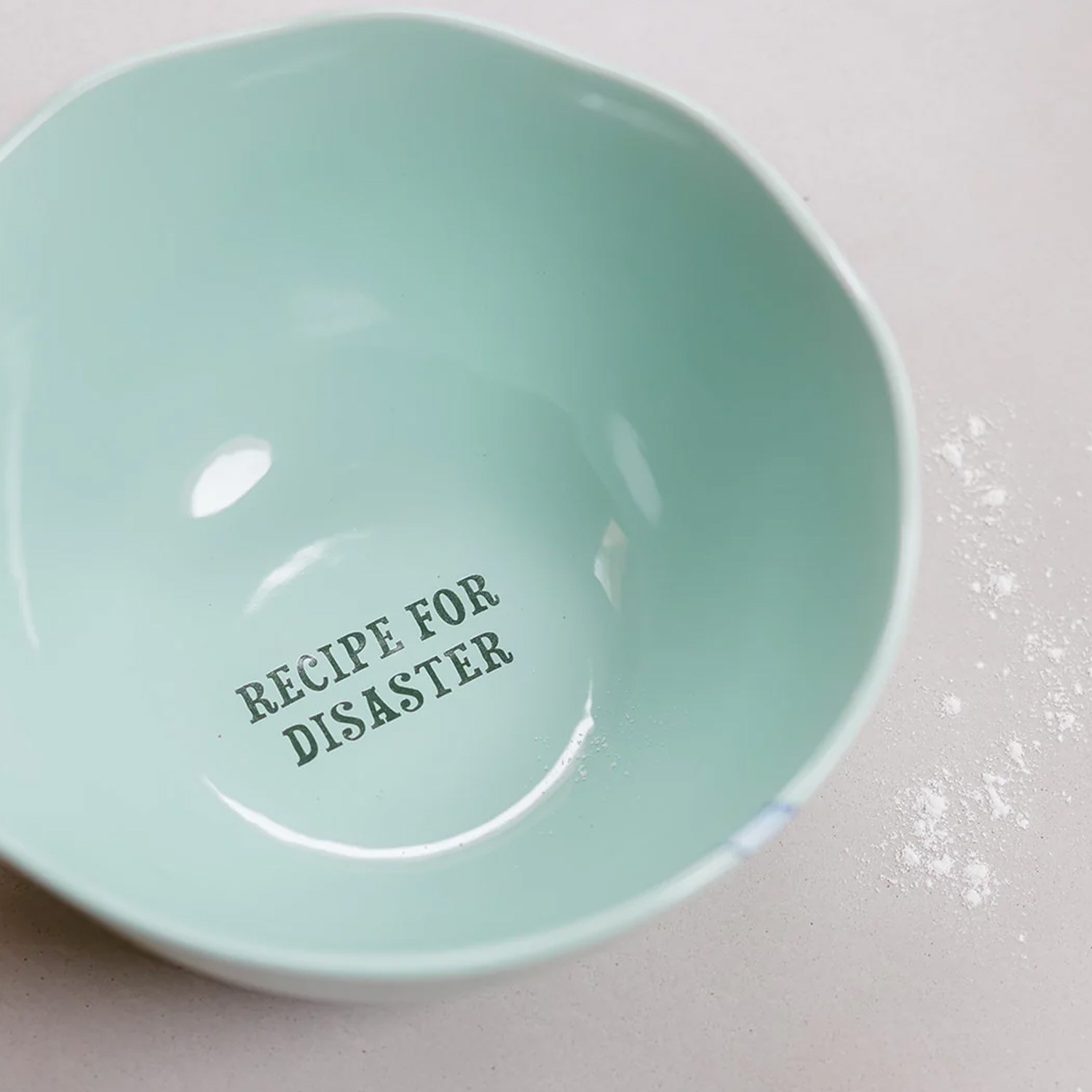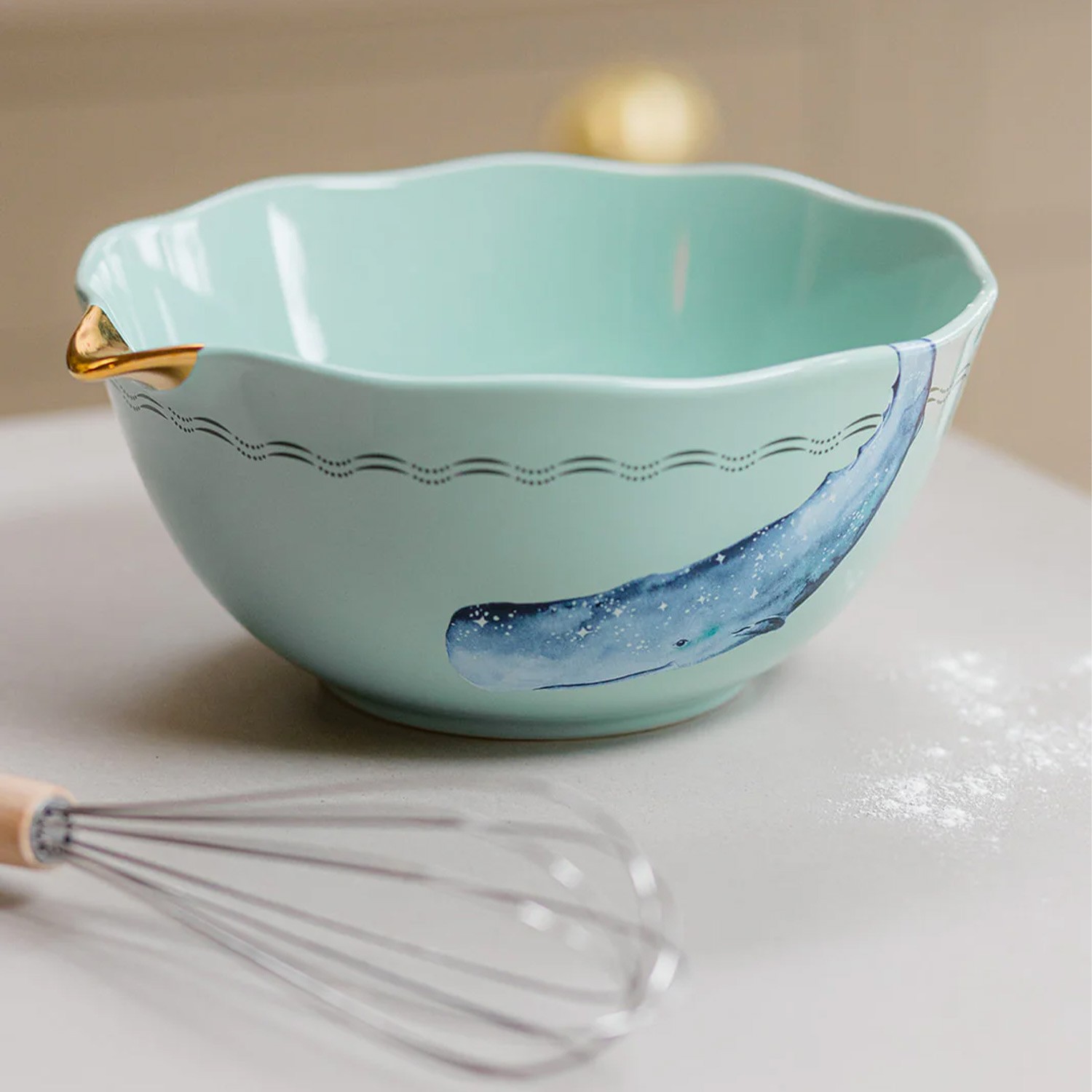 Realizzata in gres di alta qualità con una smaltatura lucida, questa ciotola di dimensioni generose è decorata con un motivo di un capodoglio, raffigurato in delicate tonalità di blu e grigio, come se nuotasse lungo il bordo della ciotola. Il disegno infatti continua all'interno, mostrando la sua coda, completa di una simpatica scritta che recita "Recipe For Disaster": perfetta per chi ama ridere mentre crea i propri piatti.
