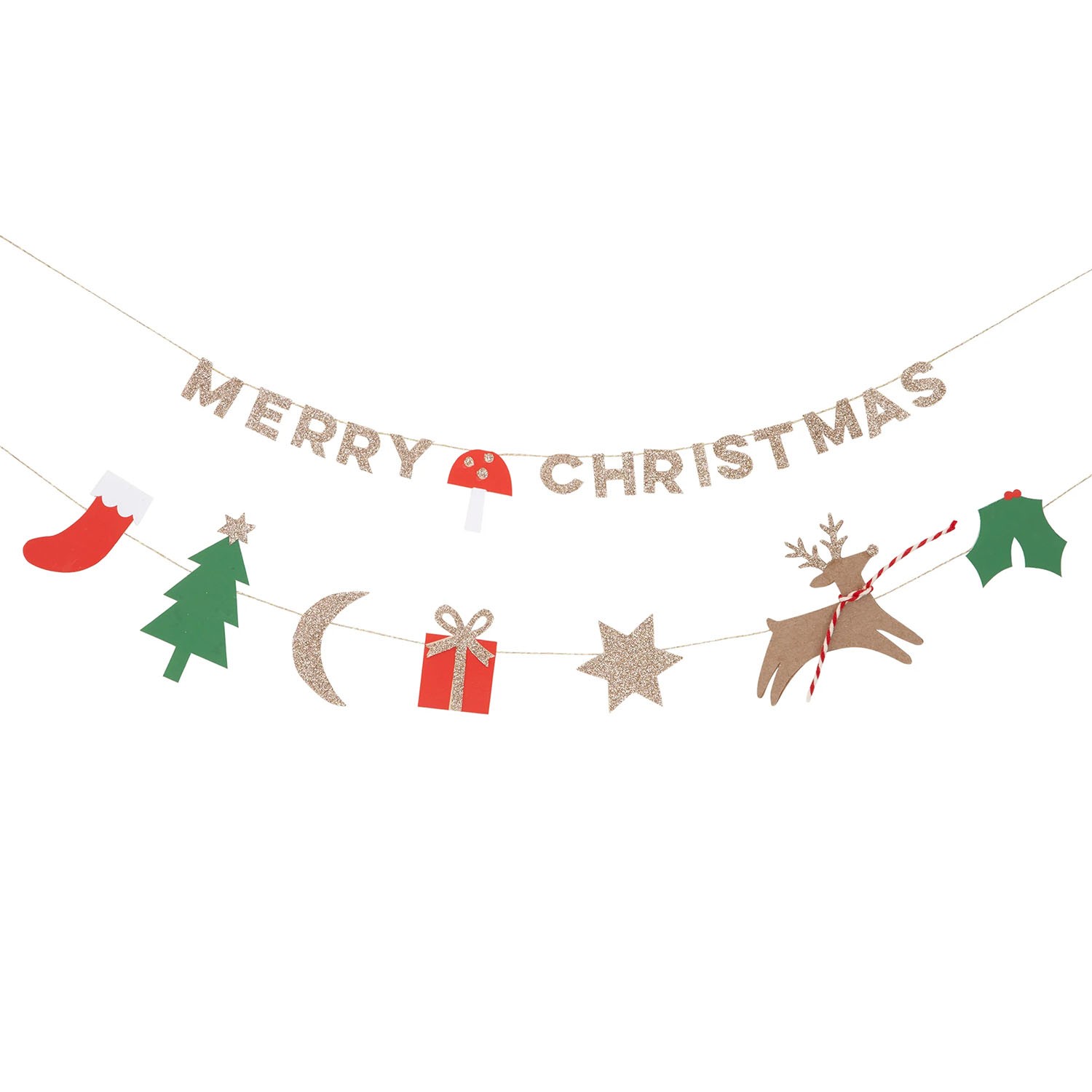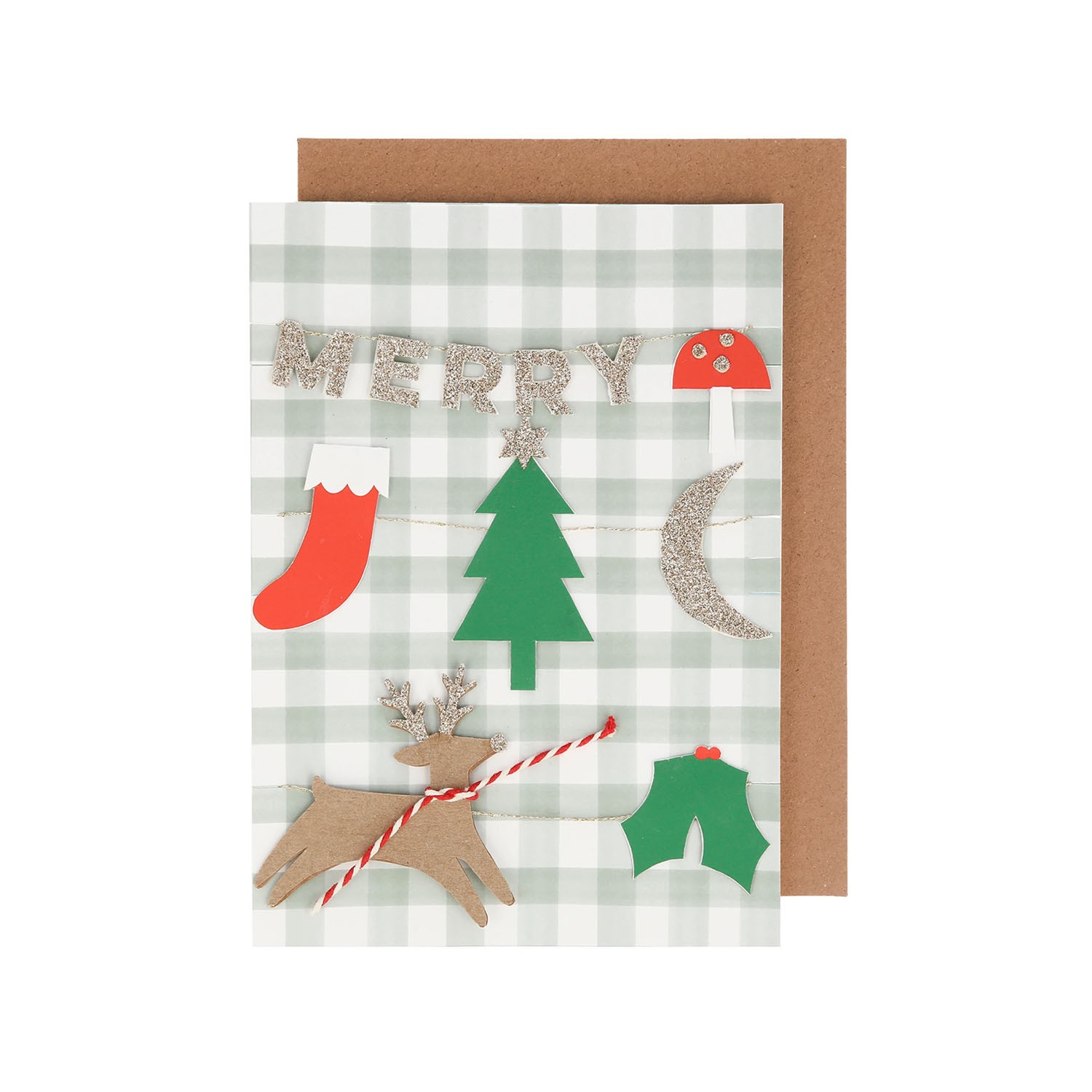 È un biglietto di auguri o una ghirlanda? Entrambi! Rimuovi semplicemente la ghirlanda, realizzata con icone festive e dettagli glitterati dorati, dal biglietto e appendila. C'è anche un'altra ghirlanda separata, con un messaggio di "Buon Natale" stampato internamente, per un doppio effetto decorativo!
