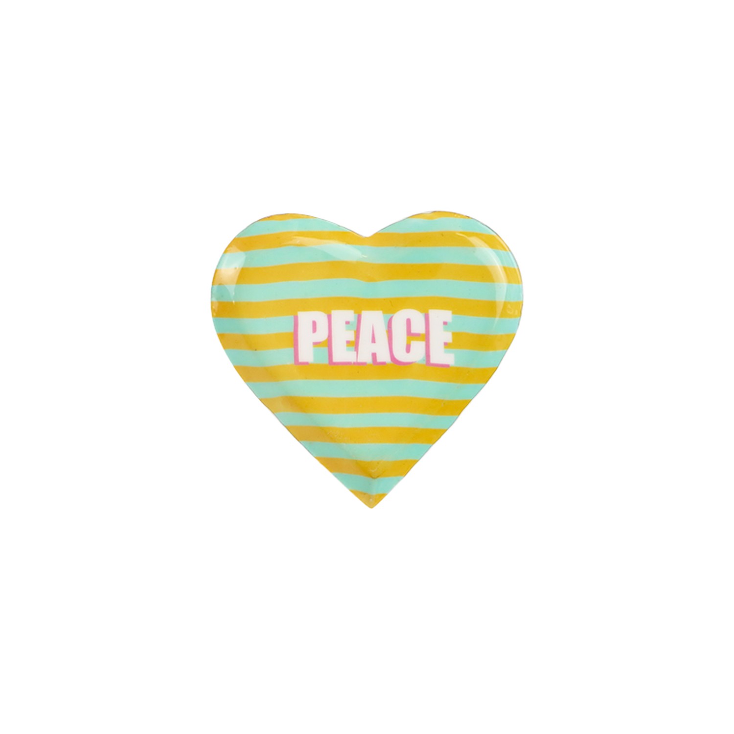 Aggiungi un tocco di dolcezza e positività alla tua tavola con questo adorabile piattino circolare. Perfetto per servire piccoli snack, dolcetti o semplicemente come elemento decorativo o svuotatasche, questo piattino a forma di cuore porterà un messaggio di pace e amore nella tua casa. Realizzato in metallo, presenta un design vivace e colorato. Le righe orizzontali in verde acqua e giallo creano un effetto allegro e accattivante, mentre la scritta rosa "PEACE" aggiunge un tocco di dolcezza e positività.