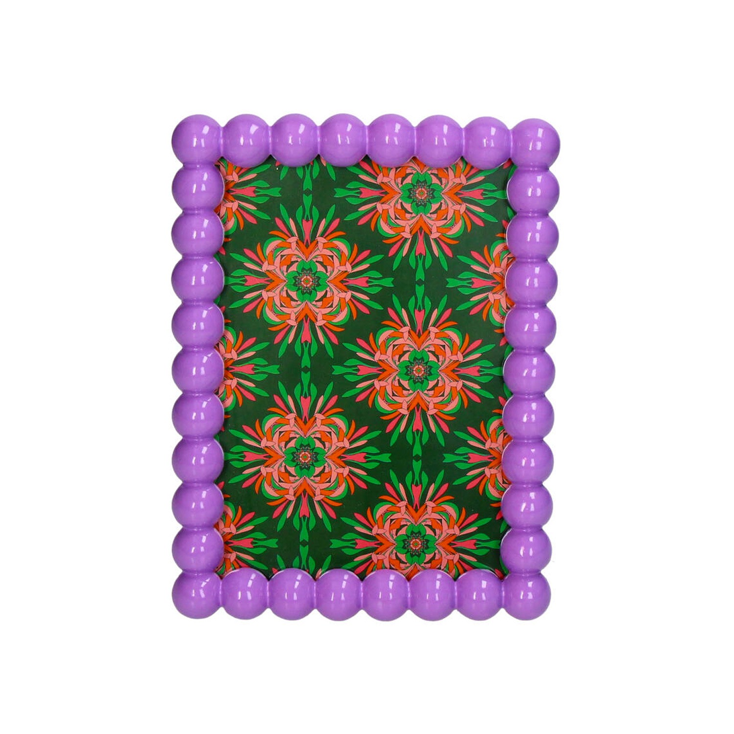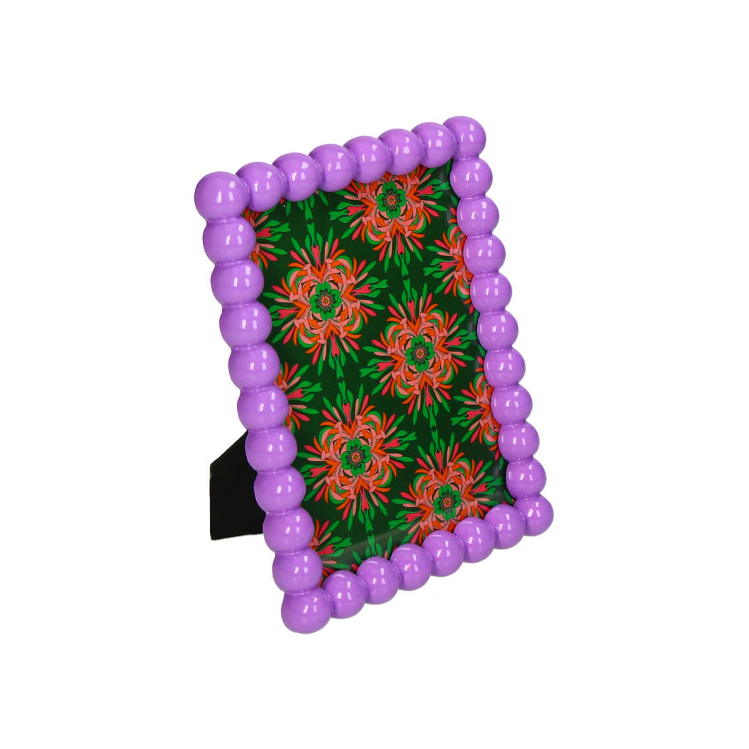 Una cornice rettangolare per foto 13x18 cm, realizzata in poliresina con perline viola, ideale per una presentazione solare e divertente.