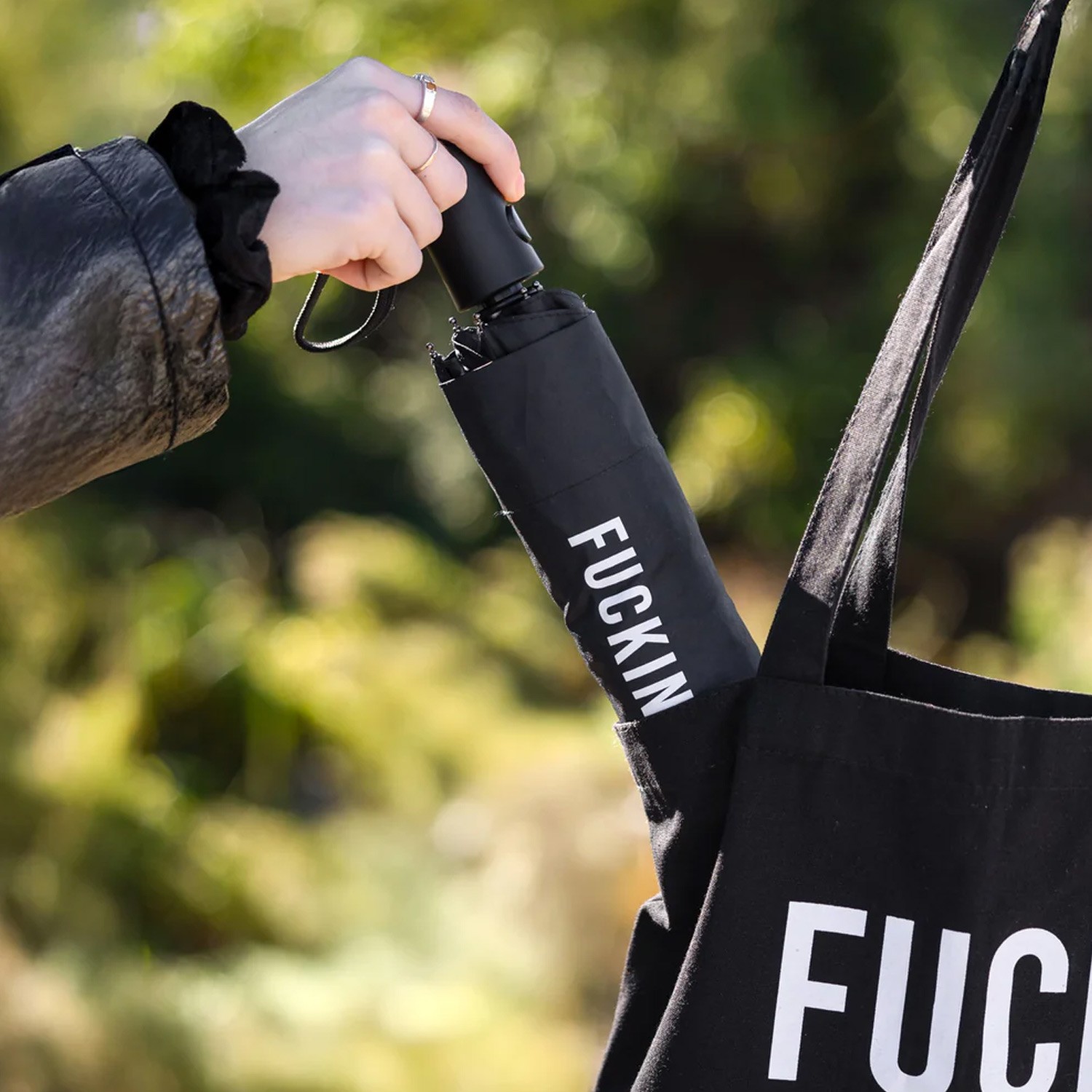 Ombrello pieghevole nero Fucking Rain
