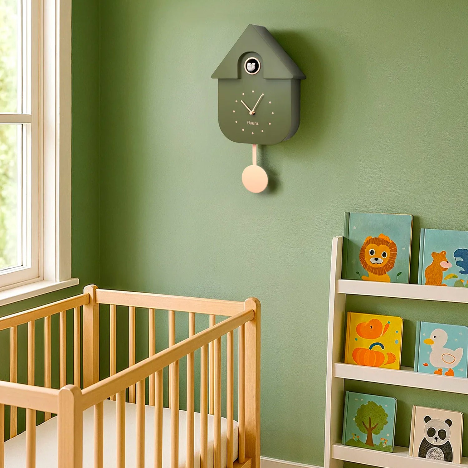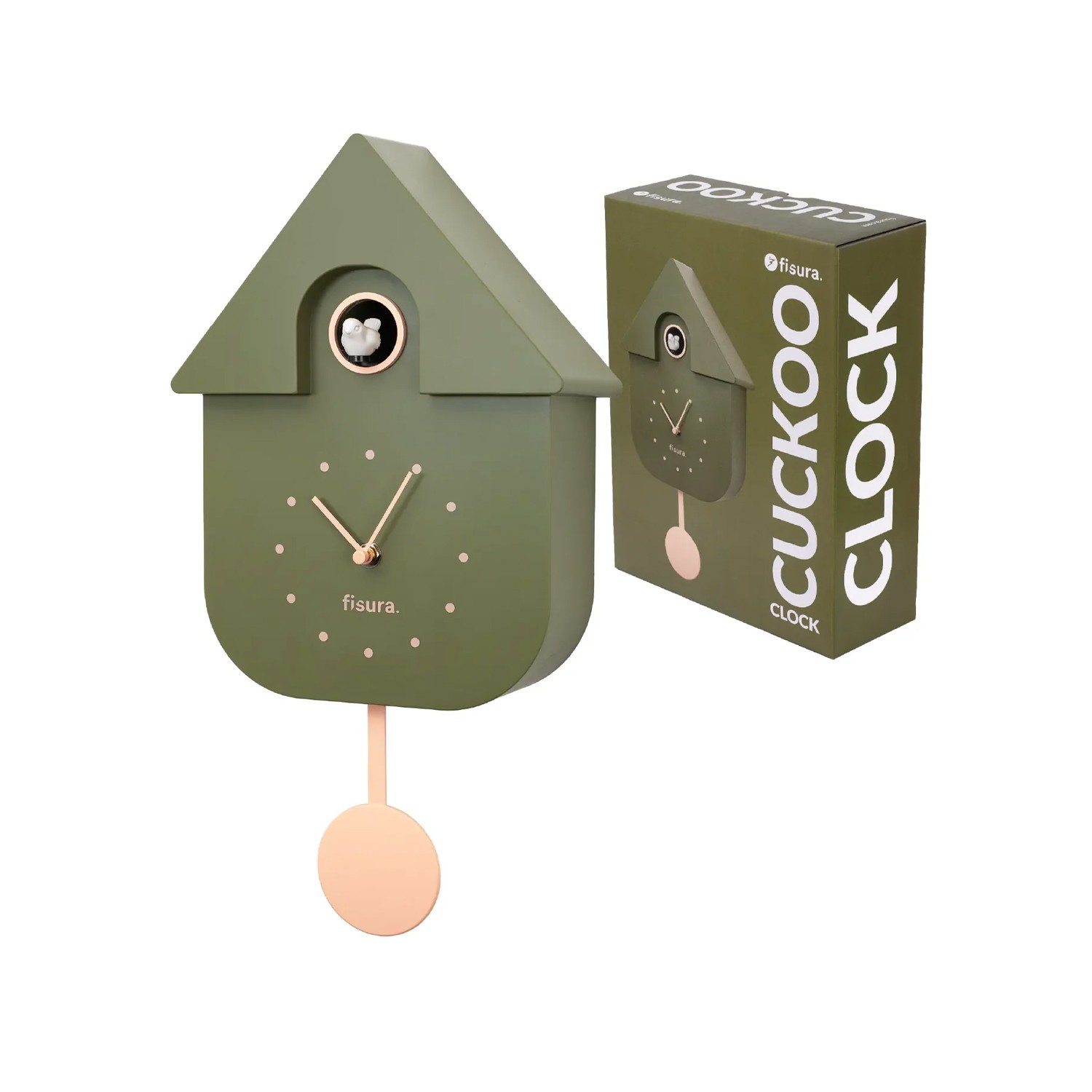 Orologio a cucù dal design moderno e colorato, a forma di simpatica casetta degli uccellini! Un redesign moderno e minimalista dell'orologio più classico del mondo, di colore verde oliva, perfetto per adattarsi all'estetica delle case più moderne.