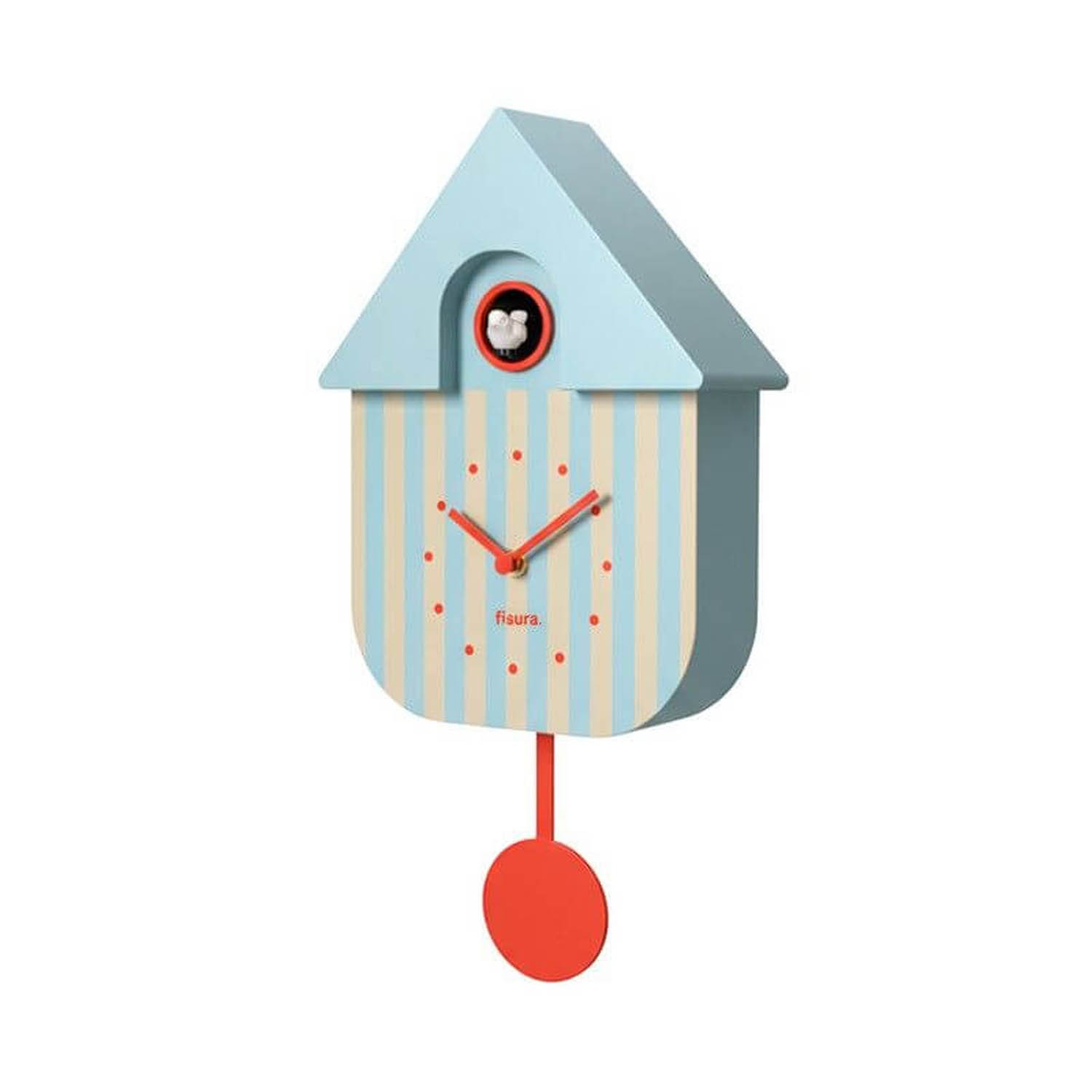 Orologio a cucù dal design moderno e colorato, a forma di simpatica casetta degli uccellini! Un redesign moderno e minimalista dell'orologio più classico del mondo, di colore azzurro a righe beige, perfetto per adattarsi all'estetica delle case più moderne.