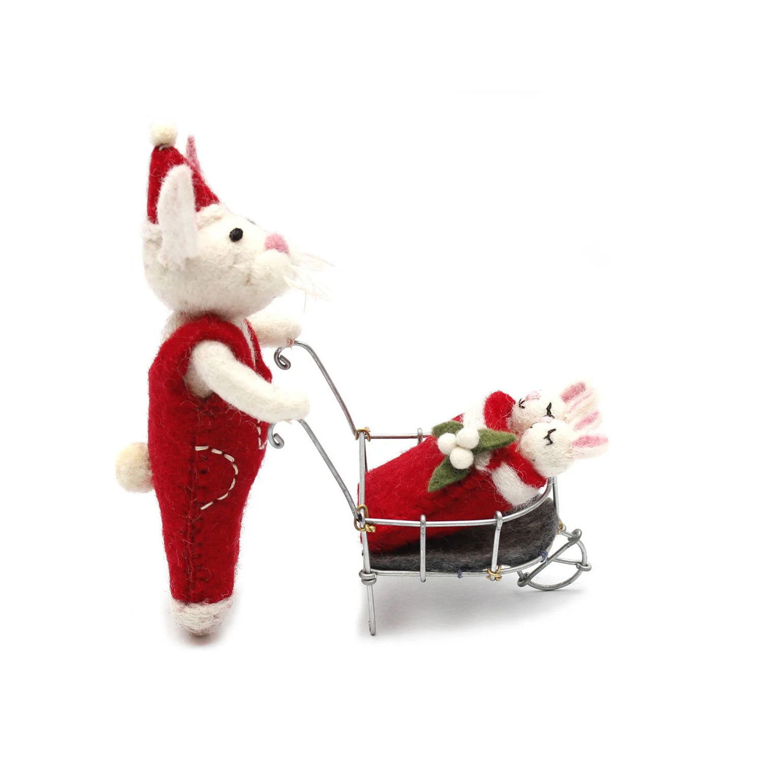 Una graziosa decorazione natalizia: un coniglio festoso che spinge una carriola con una coppia di coniglietti addormentati. Fatto a mano in feltro di lana e filo metallico al 100%, senza plastica.
