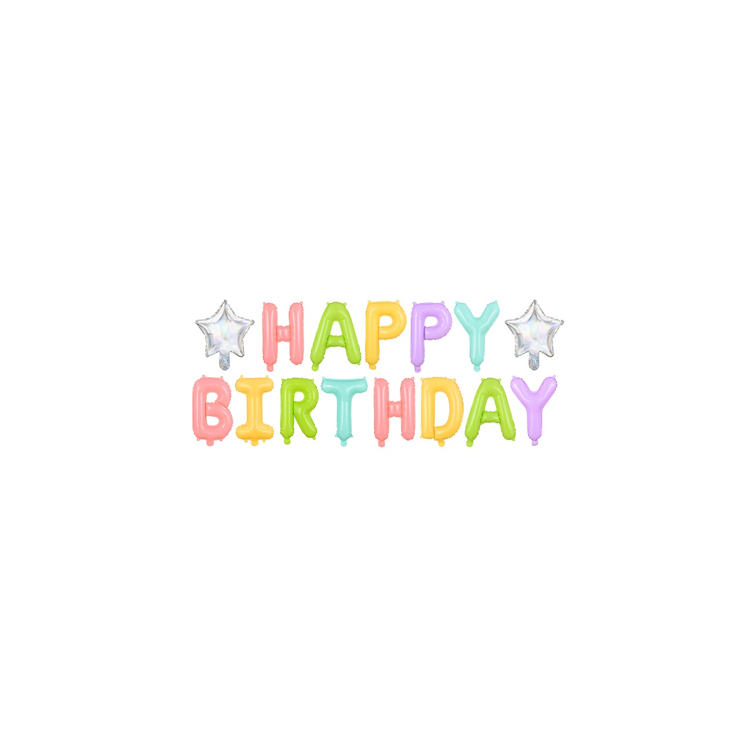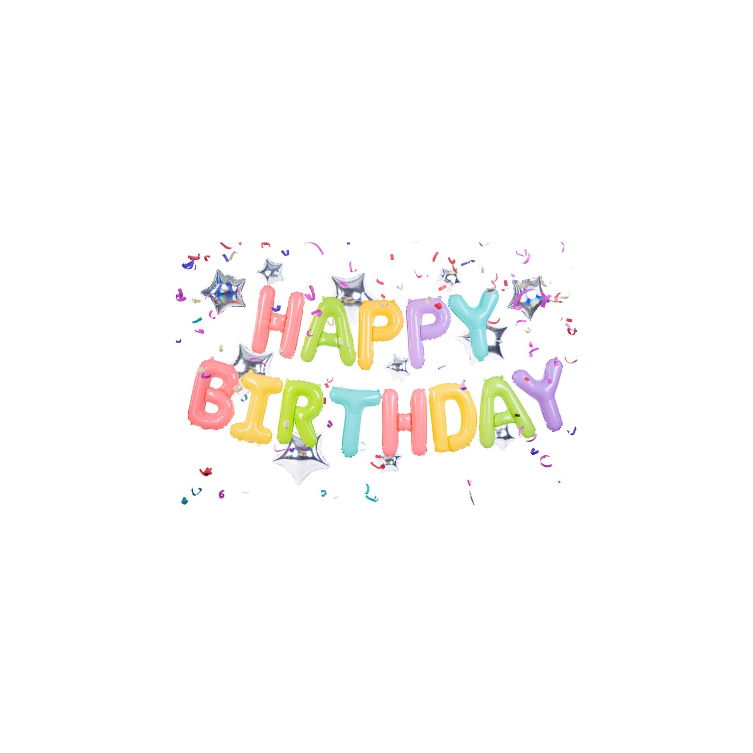 Palloncini da gonfiare che formano la scritta multicolor HAPPY BIRTHDAY multicolor. Si gonfia semplicemente a bocca attraverso l'utilizzo di una semplice cannuccia non in dotazione per riempire il palloncino di aria. WOW!!!
