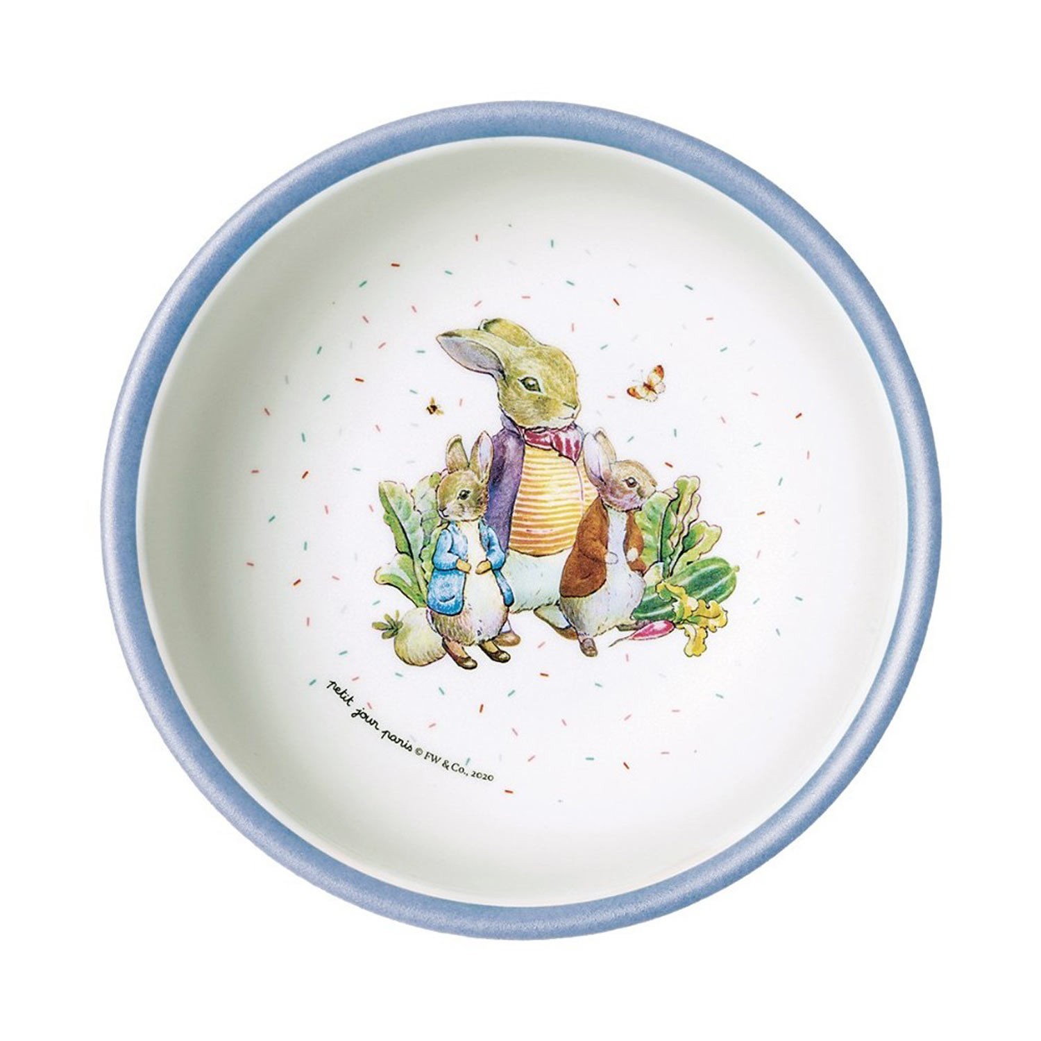 Piatto fondo in melamina con fondo bianco decorato con simpatica fantasia a tema Peter Rabbit e con un grazioso bordo azzurro. Il pranzo dei più piccini non sarà mai stato così colorato e divertente! Perfetto da abbinare alle nostre posate bimbo a tema!