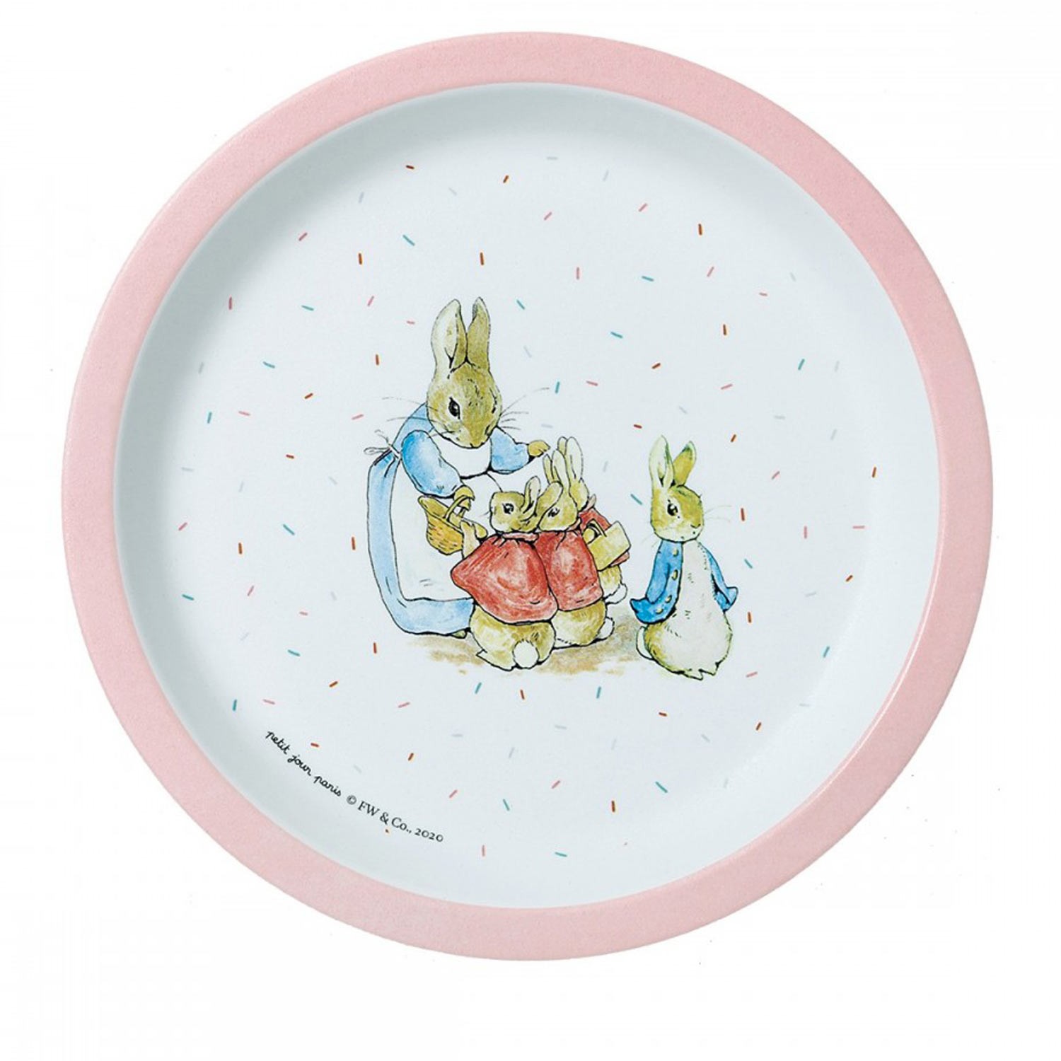 Piatto piano in melamina con fondo bianco decorato con simpatica fantasia a tema Peter Rabbit e con un grazioso bordo ergonomico rosa per aiutare i più piccoli a prendere il cibo e mangiare quasi da soli...il loro pranzo non sarà mai stato così colorato e divertente!