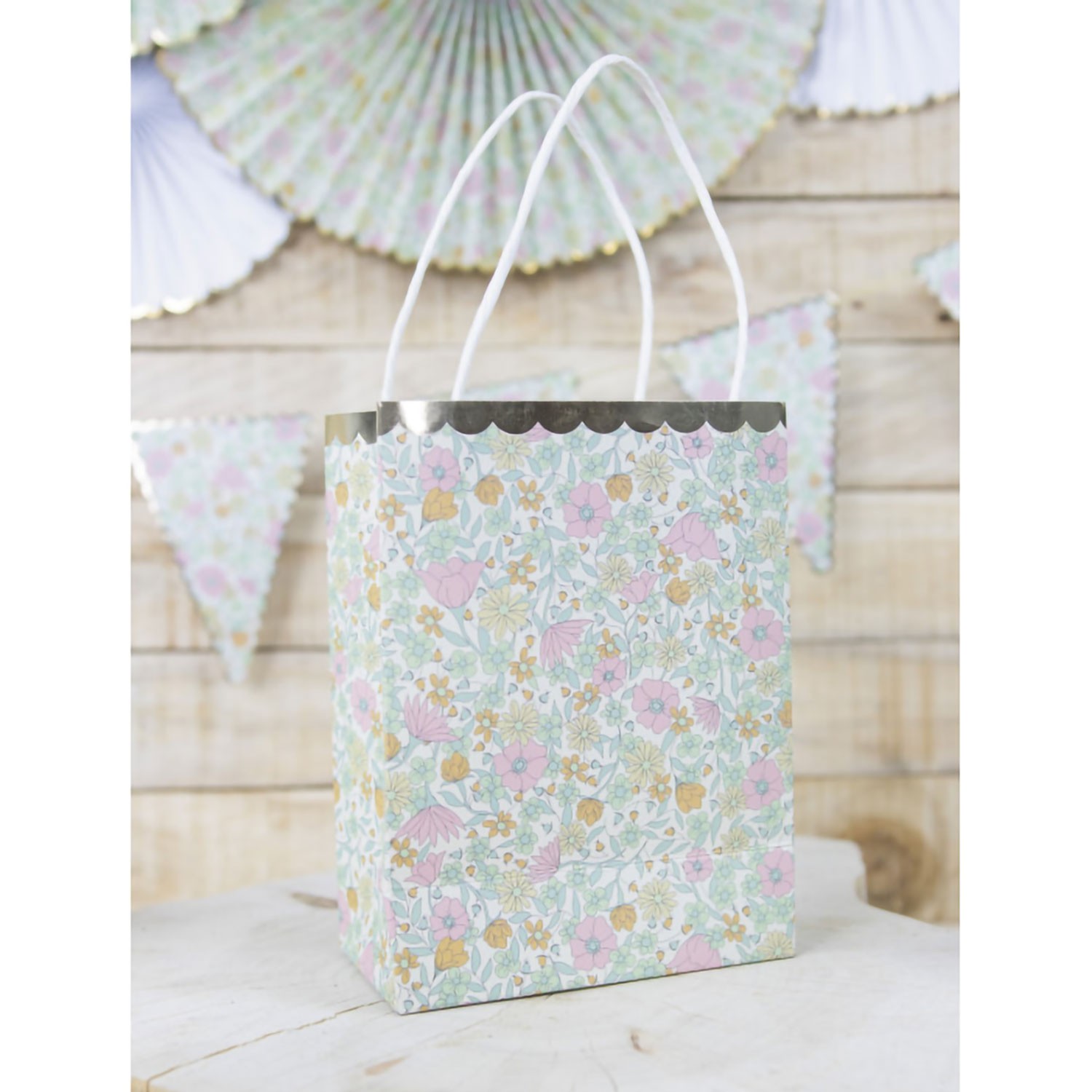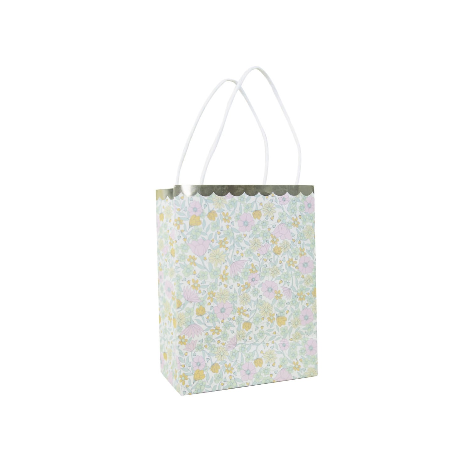 Graziose borsine di carta decorate con fiorellini colorati e margherite con fine bordo dorato e manici bianchi, ideali per sorprendere i tuoi ospiti con regalini, dolcetti o qualsiasi altra sorpresa. Confezione da 4 pezzi.