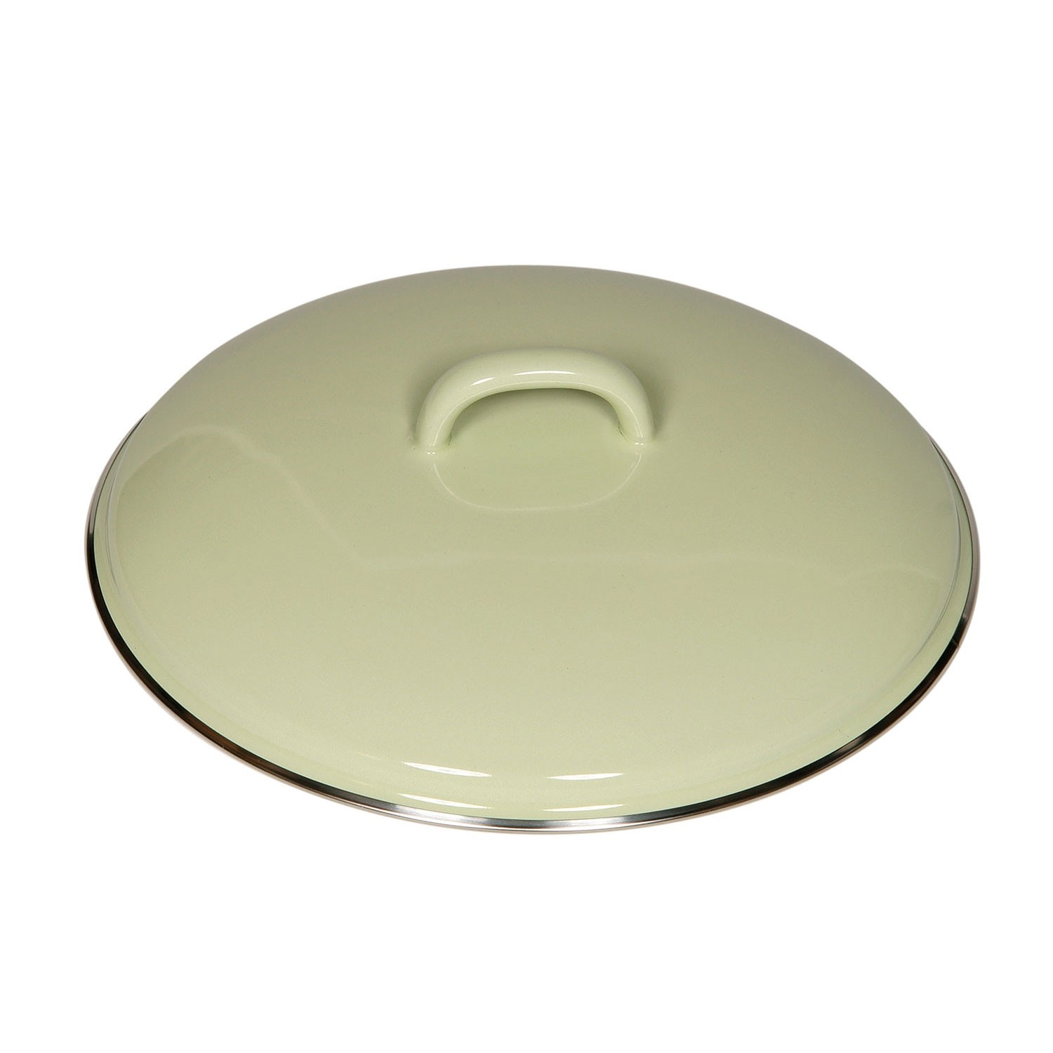 Coperchio verde Riess per tegame, con bordo cromato realizzato in smalto porcellanato ed interno bianco panna tinta unita. Adatto a tutti i tipi di cottura: cucina elettrica, gas, ceramica, induzione o barbecue. Non adatto al microonde.