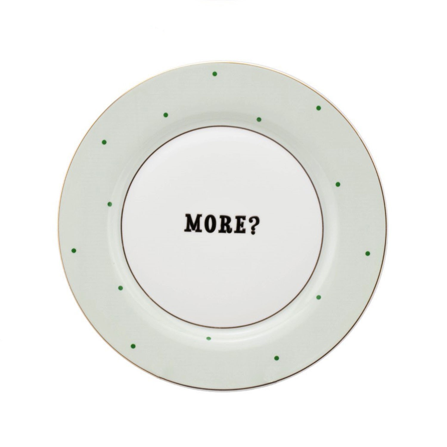 Questo piatto da dolce in fine porcellana, impreziosito da un fine bordo dorato e abbellito da un contorno verde pastello a pois e dalla scritta centrale More?, è perfetto da abbinare agli altri nostri piatti a tema della collezione Yvonne Ellen per creare un simpatico gioco di colori in tavola. Si raccomanda il lavaggio a mano.