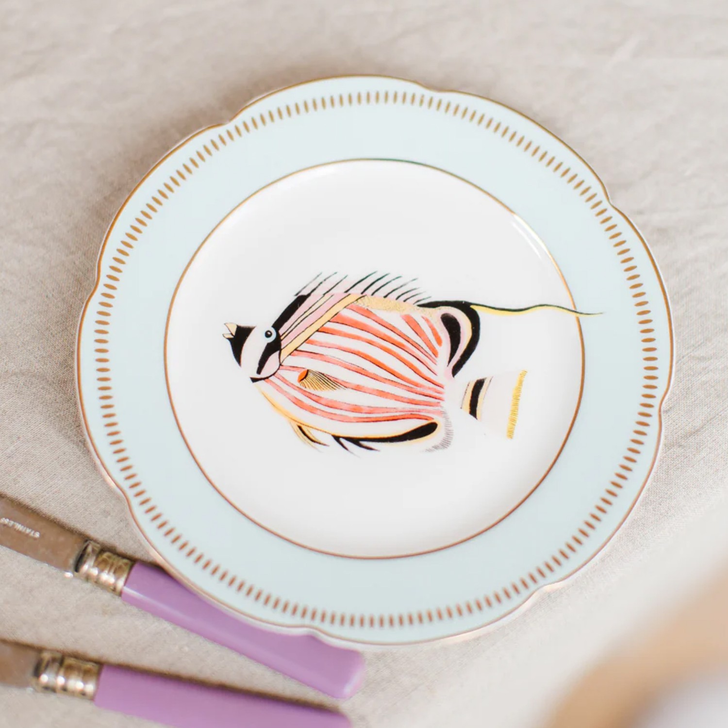 Aggiungi un tocco di eleganza e giocosità alla tua tavola con questo grazioso piattino da dessert, incarnazione dello stile vintage Yvonne Ellen. Il piatto è realizzato in fine porcellana decorata con bordo verde acqua pastello a forma di fiore dagli accenti dorati e con un simpatico pesciolino a righe disegnato al centro. Abbinalo agli altri piatti della stessa linea o appendilo al muro assieme al resto della collezione. Si raccomanda il lavaggio a mano e di non utilizzarlo nel microonde.