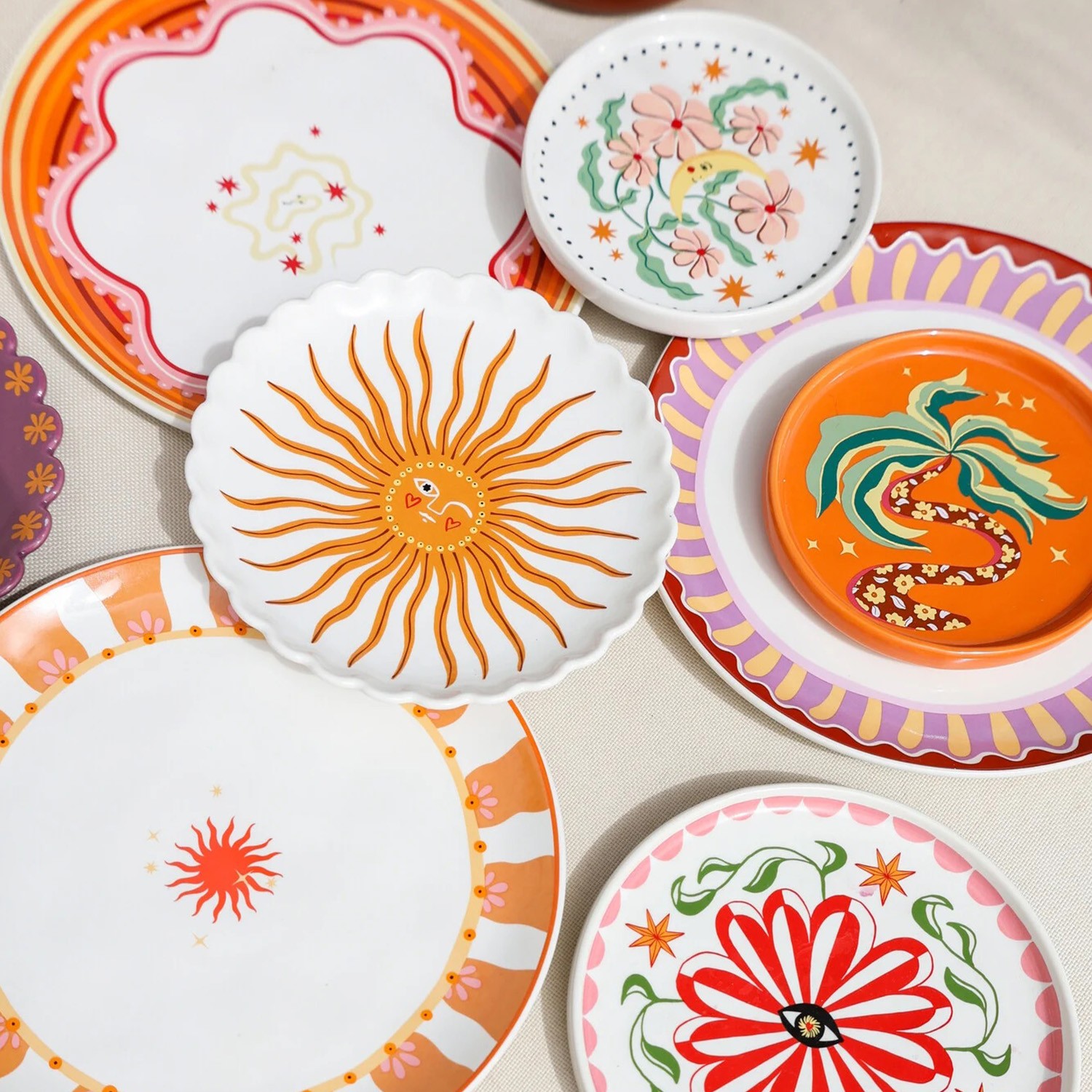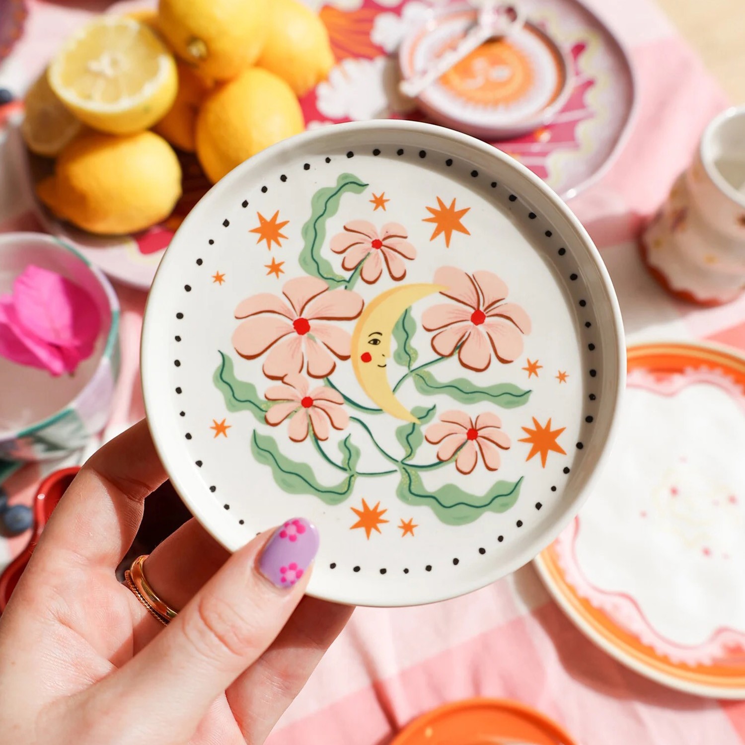Questo grazioso piattino in ceramica smaltata bianca abbellito da una fantasia floreale con luna e stelle, è perfetto come sottobicchiere e per dare un tocco caldo e allegro alla tua tavola. Resistente all'uso quotidiano e lavabile in lavastoviglie.